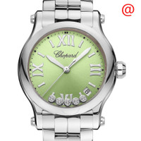 Silver-tone stainless steel case and bracelet. Fixed silver-tone stainless steel bezel. Green dial with silver-tone hands and Roman numeral hour markers. Minute markers around the outer rim. Dial Type: Analog. Date display between 4 and 5 o'clock position. 5 floating diamonds subdials. Quartz movement. Scratch resistant sapphire crystal. Solid case back. Round case shape, case size: 36 mm. Fold over clasp with a safety release. Water resistant at 30 meters / 100 feet. Functions: date, hour, minute, second. Additional Info: original box, international warranty card, manual (complete accessories). Happy Sport Series. Luxury watch style. Watch label: Swiss Made. Chopard Happy Sport Quartz Green Dial Ladies Watch 278582-3011. INFORMATION Brand: Chopard Series: Happy Sport Collection Name: Happy Sport Gender: Womens Model: 278582-3011 Watch Label: Swiss Made Movement: Quartz CASE Case Size: 36 mm Case Material: Stainless Steel Case Shape: Round Case Back: Solid BAND Band Material: Stainless Steel Band Type: Bracelet Band Color: Silver-tone Clasp: Fold Over with Safety Release DIAL Dial Color: Green Type: Analog Crystal: Scratch Resistant Sapphire Hands: Silver-tone Dial Markers: Roman Numeral Second Markers: Minute Markers around the outer rim Sub Dials: 5 Floating Diamonds Bezel: Fixed Bezel Color: Silver-tone Bezel Material: Stainless Steel FEATURES Water Resistance: 30 meters / 100 feet Calendar: Date display between 4 and 5 o'clock position Functions: Date, Hour, Minute, Second Watch Features: Diamond, Stainless Steel, Analog ADDITIONAL INFO Watch Style: Luxury Warranty: 2 Year Jomashop Warranty Additional Info: Original Box, International Warranty Card, Manual (Complete Accessories) Jomashop Sku: CP2785823011 Department: Watches Category: Watches