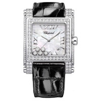 18K white gold case set with diamonds case with a leather strap. Fixed bezel. White mother of pearl dial with silver-toned hands and index hour markers. Roman numerals at the quarter hour positions. Dial Type: Analog. Date display between 4 and 5 o'clock position. Quartz movement. Scratch resistant sapphire crystal. Case dimension: 35.5 mm x 32 mm. Case thickness: 11.50 mm. Rectangle case shape. Water resistant at 30 meters / 100 feet. Functions: date, hour, minute, second. Additional Info: mobile diamonds. Luxury watch style. Watch label: Swiss Made. Chopard Happy Sport Square II Mother of Pearl Diamond Ladies Watch 283571-1001. INFORMATION Brand: Chopard Series: Happy Sport Ii Square Collection Name: Happy Sport II Square Gender: Womens Model: 283571-1001 Watch Label: Swiss Made Movement: Quartz CASE Case Size: 35.5 mm x 32 mm Case Thickness: 11.5 mm Case Material: 18kt White Gold Case Set with Diamonds Case Shape: Square BAND Band Material: Leather Band Type: Strap Band Color: Black DIAL Dial Color: White Mother of Pearl Type: Analog Crystal: Scratch Resistant Sapphire Hands: Silver-toned Dial Markers: Index Second Markers: Roman numerals at the quarter hour positions Bezel: Fixed Bezel Color: 18kt White Gold Bezel Material: Diamond Set FEATURES Water Resistance: 30 meters / 100 feet Calendar: Date display between 4 and 5 o'clock position Functions: Date, Hour, Minute, Second Watch Features: Diamond, Leather, Gold, Analog ADDITIONAL INFO Watch Style: Luxury Warranty: 2 Year Jomashop Warranty Additional Info: Mobile Diamonds Jomashop Sku: CP283571-1001 Item Variation: 283571 1001, 283571.1001, 2835711001 Department: Watches Category: Watches