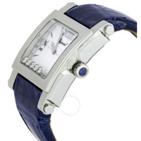 Stainless steel case with a blue (crocodile) leather bracelet. Fixed stainless steel bezel. White dial with 5 floating diamonds (0.50 carats) with silver-tone hands and stick hour markers. Silver-tone roman numerals mark the 3, 6, 9 and 12 o'clock positions. Date displays between the 4 and 5 o'clock positions. Quartz movement. Scratch resistant sapphire crystal. Solid case back. Case diameter: 35.5 mm. Case thickness: 11.50 mm. Tang clasp. Water resistant at 30 meters/100 feet. Functions: hours/ minutes/ seconds/ date. Chopard Happy Sport Stainless Steel Ladies Watch 288447-3001. GENERAL Color: White INFORMATION Brand: Chopard Series: Happy Sport Ii Square Xl Collection Name: Happy Sport II Square XL Gender: Womens Model: 288447-3001 Watch Label: Swiss Made Movement: Quartz CASE Case Size: 35.5 mm Case Thickness: 11.5 mm Case Material: Stainless Steel Case Shape: Square Case Back: Solid BAND Band Material: (Crocodile) Leather Band Type: Strap Band Color: Blue Band Length: 7 inches Clasp: Tang DIAL Dial Color: White with 5 floating diamonds (0.50 carats) Type: Analog Crystal: Scratch Resistant Sapphire Hands: Silver-tone Dial Markers: Stick Second Markers: Silver-tone Roman Numerals m,ark the 3, 6, 9 and 12 o'clock positions Bezel: Fixed Bezel Color: Silver-tone Bezel Material: Stainless Steel FEATURES Water Resistance: 30 meters / 100 feet Calendar: Date display between 4 and 5 o'clock position Functions: Hours/ Minutes/ Seconds/ Date Watch Features: Diamond, Stainless Steel, Leather, Analog ADDITIONAL INFO Watch Style: Sport Warranty: 2 Year Jomashop Warranty UPC Code: 845960010160 Jomashop Sku: CP288447-3001 Item Variation: 28/8447 Department: Watches Category: Watches