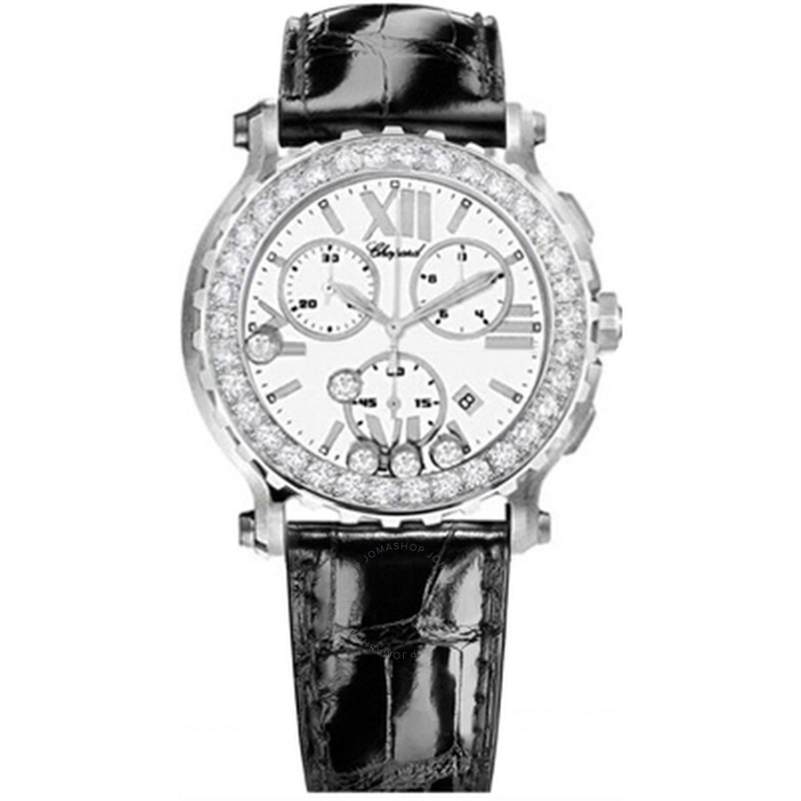 Stainless steel case with a black leather strap. Fixed bezel set with diamonds bezel. White dial with luminous hands and index hour markers. Minute markers around the outer rim. Dial Type: Analog. Date display between 4 and 5 o'clock position. Chronograph - three sub-dials displaying: 60 second, 30 minute and 12 hour. Quartz movement. Scratch resistant sapphire crystal. Case diameter: 42 mm. Round case shape. Tang clasp. Water resistant at 30 meters / 100 feet. Functions: chronograph, date, hour, minute, second. Luxury watch style. Watch label: Swiss Made. Chopard Happy Sport White Dial Chronograph Diamond Ladies Watch 288506-2001. GENERAL Color: Black / White INFORMATION Brand: Chopard Series: Happy Sport Collection Name: Happy Sport Gender: Womens Model: 28/8506-2001 Watch Label: Swiss Made Movement: Quartz CASE Case Size: 42 mm Case Material: Stainless Steel Case Shape: Round BAND Band Material: Leather Band Type: Strap Band Color: Black Clasp: Tang DIAL Dial Color: White Type: Analog Crystal: Scratch Resistant Sapphire Hands: Luminous Dial Markers: Index Second Markers: Minute Markers around the outer rim Sub Dials: Three - 60 Second, 30 Minute and 12 Hour Bezel: Fixed Bezel Color: Silver-tone Bezel Material: Diamond Set FEATURES Water Resistance: 30 meters / 100 feet Calendar: Date display between 4 and 5 o'clock position Functions: Chronograph, Date, Hour, Minute, Second Watch Features: Diamond, Chronograph, Stainless Steel, Leather, Analog ADDITIONAL INFO Watch Style: Luxury Warranty: 2 Year Jomashop Warranty Jomashop Sku: CP288506-2001 Department: Watches Category: Watches