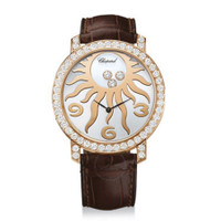 18 kt rose gold case with a brown alligator leather strap. Fixed 18 kt rose gold bezel set with diamonds. Mother of pearl dial with polished 18 kt rose gold sun with black hands. Arabic numerals mark the 3, 6 and 9 o'clock positions. Dial Type: Analog. Quartz movement. Scratch resistant sapphire crystal. Solid case back. Case diameter: 40 mm. Round case shape. Tang clasp. Water resistant at 30 meters / 100 feet. Functions: hour, minute. Luxury watch style. Chopard Happy Sun Diamond 18 kt Rose Gold Sun Brown Leather Ladies Watch 207470-5007. GENERAL Color: Black / Brown / Gold / Mother of pearl / Rose INFORMATION Brand: Chopard Series: Happy Sun Collection Name: Happy Sun Gender: Womens Model: 207470-5007 Movement: Quartz CASE Case Size: 40 mm Case Material: 18kt Rose Gold Case Shape: Round Case Back: Solid BAND Band Material: Alligator Leather Band Type: Strap Band Color: Brown Clasp: Tang DIAL Dial Color: Mother of pearl dial with polished 18 kt rose gold Type: Analog Crystal: Scratch Resistant Sapphire Hands: Black Second Markers: Arabic numerals mark the 3, 6 and 9 o'clock positions Bezel: Fixed 18 kt rose gold beze set with diamonds FEATURES Water Resistance: 30 meters / 100 feet Functions: Hour, Minute Watch Features: Diamond, Leather, Gold, Analog, Alligator Leather ADDITIONAL INFO Watch Style: Luxury Warranty: 2 Year Jomashop Warranty Jomashop Sku: CP207470-5007 Item Variation: 207470 5007, 207470.5007, 2074705007 Department: Watches Category: Watches