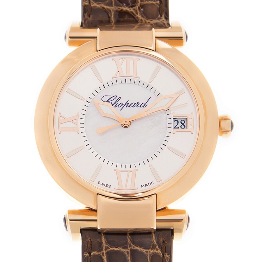 Gold-tone 18kt rose gold case with a brown alligator leather strap. Fixed 18kt rose gold bezel. Mother of pearl dial with gold-tone hands and Roman numeral hour markers. Dial Type: Analog. Luminescent hands and markers. Date display at the 3 o'clock position. Chopard Calibre FE 001 Automatic movement, containing 31 Jewels, bitting at 28800 vph, and has a power reserve of approximately 38 hours. Scratch resistant sapphire crystal. Pull / push crown. Skeleton transparent exhibition see through case back. Round case shape, case size: 40 mm. Tang clasp. Water resistant at 50 meters / 165 feet. Functions: date, hour, minute, second. Imperiale Series. Luxury watch style. Watch label: Swiss Made. Item Variations: 384241 5001, 384241.5001, 3842415001. Chopard Imperiale Automatic Men's Watch 384241-5001. GENERAL Color: Brown / Gold / Mother of pearl / Rose INFORMATION Brand: Chopard Series: Imperiale Collection Name: Imperiale Gender: Mens Model: 384241-5001 Watch Label: Swiss Made Movement: Automatic Engine: Chopard Calibre FE 001 Power Reserve: 38 hours CASE Case Size: 40 mm Case Material: 18kt Rose Gold Case Shape: Round Case Back: Skeleton Transparent Exhibition See Through BAND Band Material: Alligator Leather Band Type: Strap Band Color: Brown Clasp: Tang DIAL Dial Color: Mother of Pearl Type: Analog Crystal: Scratch Resistant Sapphire Hands: Gold-tone Dial Markers: Roman Numeral Luminiscence: Hands and Markers Bezel: Fixed Bezel Color: Gold-tone Bezel Material: 18kt Rose Gold Crown: Pull / Push FEATURES Water Resistance: 50 meters / 165 feet Calendar: Date display at the 3 o'clock position Functions: Date, Hour, Minute, Second Watch Features: Leather, Gold, Analog, Alligator Leather ADDITIONAL INFO Watch Style: Luxury Warranty: 2 Year Jomashop Warranty Jomashop Sku: CP384241-5001 Item Variation: 384241 5001, 384241.5001, 3842415001 Department: Watches Category: Watches