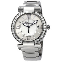 Stainless steel case with a stainless steel bracelet. Fixed stainless steel bezel set with diamonds. Silver dial with luminous hands and index hour markers. Roman numerals mark the 3, 6, 9, and 12 o'clock position. Dial Type: Analog. Date display at the 3 o'clock position. Sellita calibre SW300 automatic movement with a 42-hour power reserve. Scratch resistant sapphire crystal. Lotus shaped crown embedded with a amethyst cabochon. Solid case back. Round case shape. Case size: 40 mm. Case thickness: 9.35 mm. Hidden fold over clasp. Water resistant at 50 meters / 165 feet. Functions: hours, minutes, seconds, date. Luxury watch style. Watch label: Swiss Made. Item Variations: 388531 3004, 388531.3004, 3885313004. Chopard Imperiale Diamond Automatic 40mm Ladies Watch 388531-3004. GENERAL Color: Silver INFORMATION Brand: Chopard Series: Imperiale Collection Name: IMPERIALE Gender: Womens Model: 388531-3004 Watch Label: Swiss Made Movement: Automatic Engine: Sellita Calibre SW300 Power Reserve: 42 hours CASE Case Size: 40 mm Case Thickness: 9.35 mm Case Material: Stainless Steel Case Shape: Round Case Back: Solid BAND Band Material: Stainless Steel Band Type: Bracelet Band Color: Silver-tone Clasp: Hidden Fold Over DIAL Dial Color: Silver Type: Analog Crystal: Scratch Resistant Sapphire Hands: Luminous Dial Markers: Index Second Markers: Roman Numerals Mark the 3, 6, 9, and 12 O'clock Position Bezel: Fixed Bezel Color: Silver-tone Bezel Material: Stainless Steel set with Diamonds Crown: Lotus Shaped embedded with a Amethyst Cabochon FEATURES Water Resistance: 50 meters / 165 feet Calendar: Date display at the 3 o'clock position Functions: Hours, Minutes, Seconds, Date Watch Features: Diamond, Stainless Steel, Analog ADDITIONAL INFO Watch Style: Luxury Warranty: 2 Year Jomashop Warranty UPC Code: 842047187227 Jomashop Sku: CP388531-3004 Item Variation: 388531 3004, 388531.3004, 3885313004 Department: Watches Category: Watches