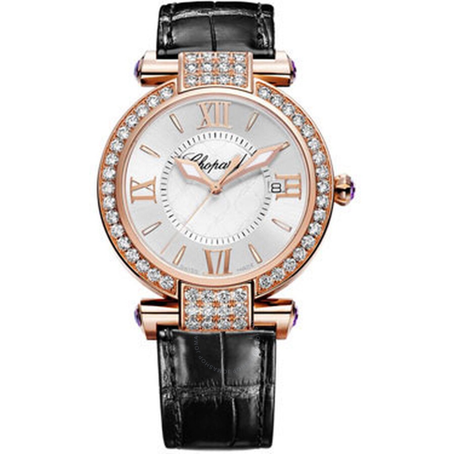 18 kt rose gold case with a black alligator leather strap. Fixed 18 kt rose gold bezel set with 58 diamonds. Mother of pearl dial with rose gold-tone hands and stick hour markers. Roman numerals mark the 3, 6, 9 and 12 o'clock positions. Minute markers around an inner ring. Dial Type: Analog. Luminescent hands and markers. Date display appears at the 3 o'clock position. Quartz movement. Scratch resistant sapphire crystal. Cabochon amethyst crown. Solid case back. Case diameter: 36 mm. Case thickness: 9 mm. Round case shape. Tang clasp. Water resistant at 50 meters / 165 feet. Functions: date, hour, minute, second. Luxury watch style. Watch label: Swiss Made. Chopard Imperiale Diamond Mother of Pearl Dial 18 kt Rose Gold Black Leather Ladies Watch 384221-5002. GENERAL Color: Black / Gold / Mother of pearl / Rose INFORMATION Brand: Chopard Series: Imperiale Collection Name: Imperiale Gender: Womens Model: 384221-5002 Watch Label: Swiss Made Movement: Quartz CASE Case Size: 36 mm Case Thickness: 9 mm Case Material: 18kt Rose Gold Case Shape: Round Case Back: Solid BAND Band Material: Alligator Leather Band Type: Strap Band Color: Black Clasp: Tang DIAL Dial Color: Mother of Pearl Type: Analog Crystal: Scratch Resistant Sapphire Hands: Rose Gold-tone Dial Markers: Stick Second Markers: Roman numerals mark the 3, 6, 9 and 12 o'clock positions. Minute Markers around an inner ring Luminiscence: Hands and Markers Bezel: Fixed 18 kt rose gold set with 58 diamonds Crown: Cabochon amethyst FEATURES Water Resistance: 50 meters / 165 feet Calendar: Date display at the 3 o'clock position Functions: Date, Hour, Minute, Second Watch Features: Diamond, Leather, Gold, Analog, Alligator Leather ADDITIONAL INFO Watch Style: Luxury Warranty: 2 Year Jomashop Warranty Jomashop Sku: CP384221-5002 Item Variation: 384221 5002, 384221.5002, 3842215002 Department: Watches Category: Watches