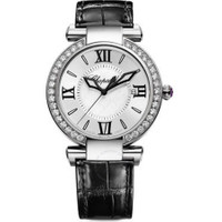 Stainless steel case with a black alligator leather strap. Fixed bezel set with 34 diamonds (1.26 ct). Silver dial with black hands and stick hour markers. Roman numerals mark the 3, 6, 9 and 12 o'clock positions. Minute markers around an inner ring. Dial Type: Analog. Luminescent hands and markers. Date display appears at the 3 o'clock position. Quartz movement. Scratch resistant sapphire crystal. Solid case back. Case diameter: 36 mm. Case thickness: 9 mm. Round case shape. Tang clasp. Water resistant at 50 meters / 165 feet. Functions: date, hour, minute, second. Luxury watch style. Watch label: Swiss Made. Chopard Imperiale Diamond Silver Dial Stainless Steel Ladies Watch 388532-3003. GENERAL Color: Black / Silver INFORMATION Brand: Chopard Series: Imperiale Collection Name: Imperiale Gender: Womens Model: 388532-3003 Watch Label: Swiss Made Movement: Quartz CASE Case Size: 36 mm Case Thickness: 9 mm Case Material: Stainless Steel Case Shape: Round Case Back: Solid BAND Band Material: Alligator Leather Band Type: Strap Band Color: Black Clasp: Tang DIAL Dial Color: Silver Type: Analog Crystal: Scratch Resistant Sapphire Hands: Black Dial Markers: Stick Second Markers: Roman numerals mark the 3, 6, 9 and 12 o'clock positions. Minute Markers around an inner ring Luminiscence: Hands and Markers Bezel: Fixed set with 34 diamonds (1.26 ct) FEATURES Water Resistance: 50 meters / 165 feet Calendar: Date display at the 3 o'clock position Functions: Date, Hour, Minute, Second Watch Features: Diamond, Stainless Steel, Leather, Analog, Alligator Leather ADDITIONAL INFO Watch Style: Luxury Warranty: 2 Year Jomashop Warranty Jomashop Sku: CP388532-3003 Item Variation: 388532 3003, 388532.3003, 3885323003 Department: Watches Category: Watches
