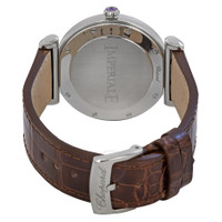 Stainless steel case with a brown (alligator) leather strap. Fixed stainless steel bezel. 18kt rose gold lugs. Mother of pearl dial with rose gold-tone hands and index hour markers. Roman numerals mark the 3, 6, 9 and 12 o'clock positions. M.inute markers around an inner ring. Dial Type: Analog. Date display at the 3 o'clock position. Quartz movement. Scratch resistant sapphire crystal. Pull / push crown. Solid case back. Round case shape. Case size: 36 mm. Case thickness: 9 mm. Tang clasp. Water resistant at 50 meters / 165 feet. Functions: date, hour, minute, second. Additional Info: case features 18k rose gold center lugs. Luxury watch style. Watch label: Swiss Made. Chopard Imperiale Mother of Pearl Dial Leather Ladies Watch 388532-6001-BR. INFORMATION Brand: Chopard Series: Imperiale Collection Name: Imperiale Gender: Womens Model: 388532-6001-BR Watch Label: Swiss Made Movement: Quartz CASE Case Size: 36 mm Case Thickness: 9 mm Case Material: Stainless Steel Case Shape: Round Case Back: Solid BAND Band Material: Alligator Leather Band Type: Strap Band Color: Brown Clasp: Tang DIAL Dial Color: Mother of Pearl Type: Analog Crystal: Scratch Resistant Sapphire Hands: Rose Gold-tone Dial Markers: Index Second Markers: Roman Numerals mark the 3, 6, 9 and 12 o'clock positions. Minute Markers around an inner ring Bezel: Fixed Bezel Color: Silver-tone Bezel Material: Stainless Steel Crown: Pull / Push FEATURES Water Resistance: 50 meters / 165 feet Calendar: Date display at the 3 o'clock position Functions: Date, Hour, Minute, Second Watch Features: Stainless Steel, Leather, Gold, Analog, Alligator Leather ADDITIONAL INFO Watch Style: Luxury Warranty: 2 Year Jomashop Warranty UPC Code: 842047132326 Additional Info: Case features 18K rose gold center lugs Jomashop Sku: CP388532-6001-BR Department: Watches Category: Watches