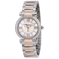 Stainless steel case with a stainless steel bracelet with 18kt rose gold links. Fixed stainless steel bezel set with diamonds. Mother of pearl dial with luminous rose gold-tone hands and index hour markers. Roman numerals mark the 3, 6, 9 and 12 o'clock positions. Minute markers around an inner ring. Dial Type: Analog. Luminescent hands and markers. Date display at the 3 o'clock position. Quartz movement. Scratch resistant sapphire crystal. Pull / push crown. Solid case back. Case diameter: 28 mm. Case thickness: 9 mm. Round case shape. Band width: 17.8 mm. Band length: 7 inches. Hidden fold over clasp. Water resistant at 50 meters / 165 feet. Functions: date, hour, minute, second. Luxury watch style. Watch label: Swiss Made. Item Variations: 388541 6004, 388541.6004, 3885416004. Chopard Imperiale Mother of Pearl Dial Steel and 18kt Rose Gold Ladies Watch 388541-6004. GENERAL Color: Gold / Mother of pearl / Rose INFORMATION Brand: Chopard Series: Imperiale Collection Name: Imperiale Gender: Womens Model: 388541-6004 Watch Label: Swiss Made Movement: Quartz CASE Case Size: 28 mm Case Thickness: 9 mm Case Material: Stainless Steel Case Shape: Round Case Back: Solid BAND Band Material: Stainless Steel and 18kt Rose Gold Band Type: Bracelet Band Color: Silver-tone Band Length: 7 inches Band Width: 17.8 mm Clasp: Hidden Fold Over DIAL Dial Color: Mother of Pearl Type: Analog Crystal: Scratch Resistant Sapphire Hands: Luminous Rose Gold-tone Dial Markers: Index Second Markers: Roman NUmerals mark the 3, 6, 9 and 12 o'clock positions. Minute Markers around an inner ring Luminiscence: Hands and Markers Bezel: Fixed Bezel Color: Silver-tone Bezel Material: Stainless Steel set with Diamonds Crown: Pull / Push FEATURES Water Resistance: 50 meters / 165 feet Calendar: Date display at the 3 o'clock position Functions: Date, Hour, Minute, Second Watch Features: Diamond, Stainless Steel, Gold, Analog ADDITIONAL INFO Watch Style: Luxury Warranty: 2 Year Jomashop Warranty UPC Code: 722630387268 Jomashop Sku: CP388541-6004 Item Variation: 388541 6004, 388541.6004, 3885416004 Department: Watches Category: Watches