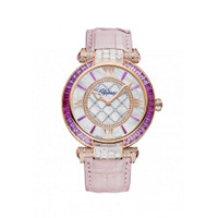 18 carat rose gold diamond set case with a pink alligator leather (matt) strap. Pink sapphire set bezel. Mother-of-pearl with diamonds dial with rose gold-tone hands and Roman numeral/ sapphire index hour markers. Dial Type: Analog. Automatic movement. Chopard 01.03-c engine. Scratch resistant sapphire crystal. Skeleton transparent exhibition see through case back. Case diameter: 40 mm. Round case shape. Tang clasp. Water resistant at 50 meters / 165 feet. Functions: hour, minute. Luxury watch style. Watch label: Swiss Made. Chopard Imperiale Mother-of-Pearl with Diamonds Dial Ladies Watch 384239-5010. INFORMATION Brand: Chopard Series: Imperiale Collection Name: Imperiale Gender: Womens Model: 384239-5010 Watch Label: Swiss Made Movement: Automatic Engine: Chopard Calibre 01.03-C Power Reserve: 60 hours CASE Case Size: 40 mm Case Material: 18kt Rose Gold Diamond Set Case Shape: Round Case Back: Skeleton Transparent Exhibition See Through BAND Band Material: Alligator Leather (matt) Band Type: Strap Band Color: Pink Clasp: Tang DIAL Dial Color: Mother-of-Pearl with Diamonds Type: Analog Crystal: Scratch Resistant Sapphire Hands: Rose Gold-tone Dial Markers: Roman Numeral/ Sapphire Index Bezel: Pink Sapphire Set FEATURES Water Resistance: 50 meters / 165 feet Functions: Hour, Minute Watch Features: Diamond, Leather, Gold, Analog, Alligator Leather ADDITIONAL INFO Watch Style: Luxury Warranty: 2 Year Jomashop Warranty Jomashop Sku: CP384239-5010 Item Variation: 384239 5010, 384239.5010, 3842395010 Department: Watches Category: Watches