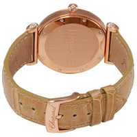 18kt rose gold case with a brown leather strap. Fixed 18kt rose gold set with 58 diamonds bezel. Mother of pearl (diamond-set) dial with rose gold-tone skeleton hands and diamond-set index hour markers. Roman numerals appear at the 3, 6, 9 and 12 o'clock positions. Dial Type: Analog. Automatic movement with a 42-hour power reserve. Scratch resistant sapphire crystal. Pull / push crown. Solid case back. Round case shape, case size: 36 mm, case thickness: 9 mm. Tang clasp. Water resistant at 50 meters / 165 feet. Functions: hour, minute, second. Sport watch style. Watch label: Swiss Made. Chopard Imperiale Mother of Pearl with Diamonds Dial Ladies Watch 384242-5005. INFORMATION Brand: Chopard Gender: Womens Model: 384242-5005 Watch Label: Swiss Made Movement: Automatic Power Reserve: 42 hours CASE Case Size: 36 mm Case Thickness: 9 mm Case Material: 18kt Rose Gold Case Shape: Round Case Back: Solid BAND Band Material: Leather Band Type: Strap Band Color: Brown Clasp: Tang DIAL Dial Color: Mother of Pearl (Diamond-set) Type: Analog Crystal: Scratch Resistant Sapphire Hands: Rose Gold-tone Skeleton Dial Markers: Diamond-set Index Second Markers: Roman Numerals appear at the 3, 6, 9 and 12 o'clock positions. Bezel: Fixed Bezel Material: 18kt Rose Gold set with 58 Diamonds Crown: Pull / Push FEATURES Water Resistance: 50 meters / 165 feet Functions: Hour, Minute, Second Watch Features: Diamond, Leather, Gold, Analog ADDITIONAL INFO Watch Style: Sport Warranty: 2 Year Jomashop Warranty Jomashop Sku: CP384242-5005BR Department: Watches Category: Watches