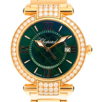 Rose gold-tone 18kt rose gold case and bracelet. Fixed rose gold-tone bezel with diamond set 18kt rose gold. Green dial with rose gold-tone hands and Roman numeral hour markers. Minute scale around the inner rim. Dial Type: Analog. Luminescent hands and markers. Date display at the 3 o'clock position. Quartz movement. Scratch resistant sapphire crystal. Pull / push crown. Solid case back. Round case shape, case size: 36 mm. Fold over clasp. Water resistant at 50 meters / 165 feet. Functions: date, hour, minute, second. Additional Info: original box, international warranty card, manual (complete accessories). Imperiale Series. Luxury watch style. Watch label: Swiss Made. Chopard Imperiale Quartz Diamond Green Dial Ladies Watch 384221-5016. INFORMATION Brand: Chopard Series: Imperiale Collection Name: Imperiale Gender: Womens Model: 384221-5016 Watch Label: Swiss Made Movement: Quartz CASE Case Size: 36 mm Case Material: 18kt Rose Gold Case Shape: Round Case Back: Solid BAND Band Material: 18kt Rose Gold Band Type: Bracelet Band Color: Rose Gold-tone Clasp: Fold Over DIAL Dial Color: Green Type: Analog Crystal: Scratch Resistant Sapphire Hands: Rose Gold-tone Dial Markers: Roman Numeral Second Markers: Minute Scale around the inner rim Luminiscence: Hands and Markers Bezel: Fixed Bezel Color: Rose Gold-tone Bezel Material: Diamond Set 18kt Rose Gold Crown: Pull / Push FEATURES Water Resistance: 50 meters / 165 feet Calendar: Date display at the 3 o'clock position Functions: Date, Hour, Minute, Second Watch Features: Diamond, Gold, Analog ADDITIONAL INFO Watch Style: Luxury Warranty: 2 Year Jomashop Warranty Additional Info: Original Box, International Warranty Card, Manual (Complete Accessories) Jomashop Sku: CP384221-5016 Department: Watches Category: Watches