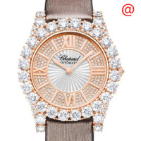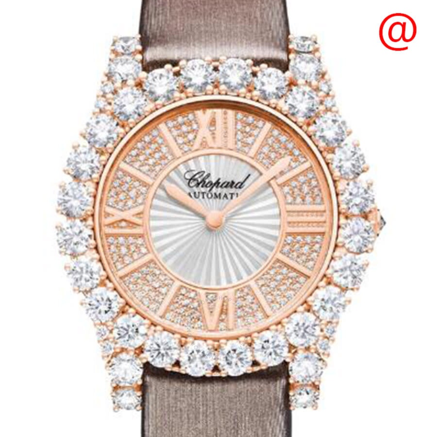 Rose gold-tone 18kt rose gold case with a brown silk strap. Fixed rose gold-tone bezel with diamond set 18kt rose gold. Silver-tone dial with rose gold-tone hands and Roman numeral hour markers. Dial Type: Analog. Automatic movement. Scratch resistant sapphire crystal. Pull / push crown. Transparent see through case back. Round case shape, case size: 35 mm. Buckle clasp. Functions: hour, minute. Additional Info: original box, international warranty card, manual (complete accessories). L Heure Du Diamant Series. Luxury watch style. Watch label: Swiss Made. Chopard L Heure Du Diamant Automatic Diamond Silver Dial Ladies Watch 139419-5601. INFORMATION Brand: Chopard Series: L Heure Du Diamant Collection Name: L Heure Du Diamant Gender: Womens Model: 139419-5601 Watch Label: Swiss Made Movement: Automatic CASE Case Size: 35 mm Case Material: 18kt Rose Gold Case Shape: Round Case Back: Transparent See Through BAND Band Material: Silk Band Type: Strap Band Color: Brown Clasp: Buckle DIAL Dial Color: Silver-tone Type: Analog Crystal: Scratch Resistant Sapphire Hands: Rose Gold-tone Dial Markers: Roman Numeral Bezel: Fixed Bezel Color: Rose Gold-tone Bezel Material: Diamond Set 18kt Rose Gold Crown: Pull / Push FEATURES Functions: Hour, Minute Watch Features: Diamond, Gold, Analog ADDITIONAL INFO Watch Style: Luxury Warranty: 2 Year Jomashop Warranty Additional Info: Original Box, International Warranty Card, Manual (Complete Accessories) Jomashop Sku: CP1394195601 Department: Watches