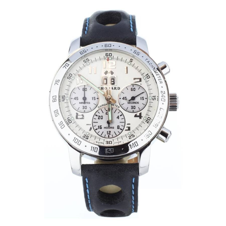 Silver-tone stainless steel case with a blue alligator band. Silver-tone stainless steel bezel. White dial with Arabic numeral hour markers. Tachymeter scale around the outer rim. Dial Type: Analog. Luminescent hands and markers. Date display at the 12 o'clock position. Chronograph - three sub-dials displaying: 60 second, 30 minute and 12 hour. Automatic movement. Scratch resistant sapphire crystal. Pull / push crown. Solid case back. Round case shape, case size: 40.5 mm. Water resistant at 50 meters / 165 feet. Functions: chronograph, date, hour, minute, second. Mille Miglia Series. Luxury watch style. Watch label: Swiss Made. Chopard Mille Miglia Chronograph Automatic White Dial Men's Watch 168934-3001. GENERAL Box Type: Original Box CASE Case Material: Stainless Steel Case Shape: Round Case Back: Solid BAND Band Material: Alligator Band Type: Strap Band Color: Blue DIAL Dial Color: White Type: Analog Crystal: Scratch Resistant Sapphire Dial Markers: Arabic Numeral Second Markers: Tachymeter Scale around the outer rim Sub Dials: Three - 60 Second, 30 Minute and 12 Hour Luminiscence: Hands and Markers Bezel Color: Silver-tone Bezel Material: Stainless Steel Crown: Pull / Push INFORMATION Brand: Chopard Series: Mille Miglia Collection Name: Mille Miglia Gender: Mens Model: 168934-3001 Watch Label: Swiss Made Movement: Automatic FEATURES Water Resistance: 50 meters / 165 feet Calendar: Date display at the 12 o'clock position Functions: Chronograph, Date, Hour, Minute, Second Watch Features: Alligator Leather, Analog, Stainless Steel, Chronograph ADDITIONAL INFO Watch Style: Luxury Warranty: 2 Year Jomashop Warranty Jomashop Sku: CP1689343001 Department: Watches