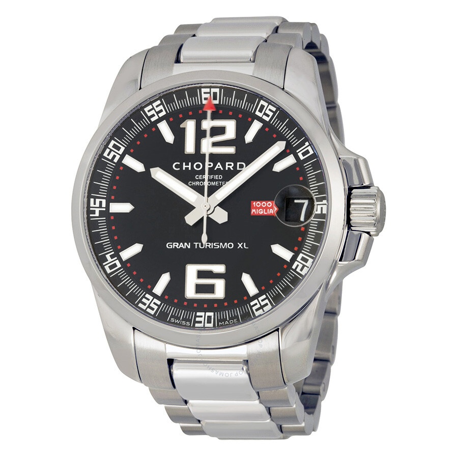 Stainless steel case with a stainless steel bracelet. Fixed stainless steel bezel. Black dial with silver-tone hands and index hour markers. Arabic numerals mark the 6 and 12 o'clock positions. minute markers around the outer rim. Dial Type: Analog. Luminescent hands and markers. Date displays at the 3 o'clock position. Automatic movement with about 46 hours of power reserve. Scratch resistant sapphire crystal. Screw down crown. Skeleton case back. Case size: 44 mm. Case thickness: 14.2 mm. Round case shape. Band width: 22 mm. Band length: 8 inches. Hidden folding clasp. Water resistant at 100 meters/ 330 feet. Functions: hours, minutes, seconds, date. Luxury watch style. Watch label: Swiss Made. Item Variations: 158997 3001, 158997.3001, 1589973001. Chopard Mille Miglia Gran Turismo XL Men's Watch 158997-3001. GENERAL Color: Black / Skeleton CASE Case Size: 44 Case Thickness: 14.2 mm Case Material: Stainless Steel Case Shape: Round Case Back: Skeleton BAND Band Material: Stainless Steel Band Type: Bracelet Band Color: Silver-tone Band Length: 8 inches Band Width: 22 mm Clasp: Hidden Fold Over DIAL Dial Color: Black Type: Analog Crystal: Scratch Resistant Sapphire Hands: Silver-tone Dial Markers: Index Second Markers: Arabic numerals mark the 6 and 12 o'clock positions. Minute Markers around the outer rim Luminiscence: Hands and Markers Bezel: Fixed Bezel Color: Silver-tone Bezel Material: Stainless Steel Crown: Screw Down INFORMATION Brand: Chopard Series: Mille Miglia Gran Turismo Xl Collection Name: Mille Miglia Gran Turismo XL Gender: Mens Model: 158997-3001 Watch Label: Swiss Made Movement: Automatic Engine: ETA Caliber A07.111 Power Reserve: 46 hours FEATURES Water Resistance: 100 meters / 330 feet Calendar: Date display at the 3 o'clock position Functions: Hours, Minutes, Seconds, Date Watch Features: Stainless Steel, Analog ADDITIONAL INFO Watch Style: Luxury Warranty: 2 Year Jomashop Warranty UPC Code: 845960007375 Jomashop Sku: CP158997-3001 Item Variation: 158997 3001, 158997.3001, 1589973001 Department: Watches Category: Watches