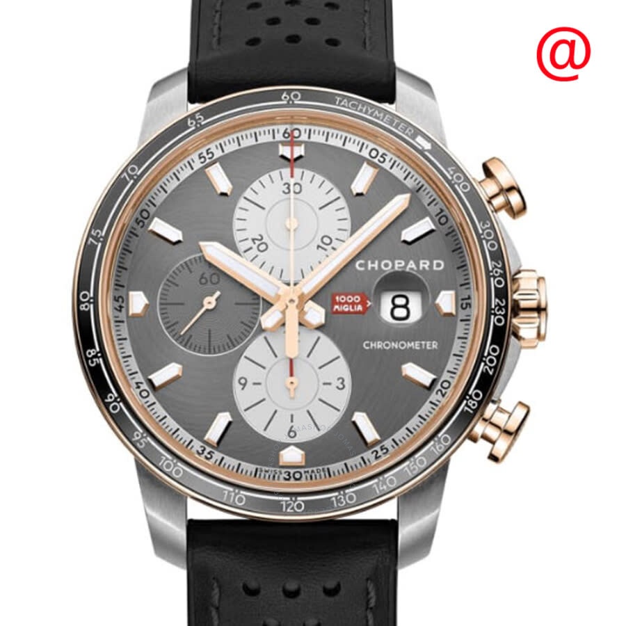 Silver-tone stainless steel case with a black leather strap. Fixed tachymeter scale black stainless steel bezel. Black dial with rose gold-tone hands and index hour markers. Minute markers around the outer rim. Dial Type: Analog. Luminescent hands and markers. Date display at the 3 o'clock position. Chronograph - three sub-dials displaying: 60 second, 30 minute and 12 hour. Automatic movement. Scratch resistant sapphire crystal. Screw down crown. Solid case back. Round case shape, case size: 44 mm. Buckle clasp. Water resistant at 100 meters / 330 feet. Functions: chronograph, date, hour, minute, second. Additional Info: original box, international warranty card, manual (complete accessories). Mille Miglia Gt Series. Luxury watch style. Watch label: Swiss Made. Chopard Mille Miglia GT Chronograph Automatic Black Dial Men's Watch 168571-6003. CASE Case Size: 44 Case Material: Stainless Steel Case Shape: Round Case Back: Solid BAND Band Material: Leather Band Type: Strap Band Color: Black Clasp: Buckle DIAL Dial Color: Black Type: Analog Crystal: Scratch Resistant Sapphire Hands: Rose Gold-tone Dial Markers: Index Second Markers: Minute Markers around the outer rim Sub Dials: Three - 60 Second, 30 Minute and 12 Hour Luminiscence: Hands and Markers Bezel: Fixed Tachymeter Scale Bezel Color: Black Bezel Material: Stainless Steel Crown: Screw Down INFORMATION Brand: Chopard Series: Mille Miglia Gt Collection Name: Mille Miglia GT Gender: Mens Model: 168571-6003 Watch Label: Swiss Made Movement: Automatic FEATURES Water Resistance: 100 meters / 330 feet Calendar: Date display at the 3 o'clock position Functions: Chronograph, Date, Hour, Minute, Second Watch Features: Chronograph, Stainless Steel, Leather, Gold, Analog ADDITIONAL INFO Watch Style: Luxury Warranty: 2 Year Jomashop Warranty Additional Info: Original Box, Manual (Complete Accessories) Jomashop Sku: CP1685716003 Department: Watches Category: Watches