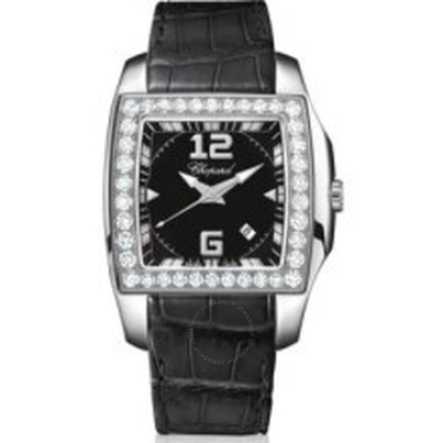 Silver-tone stainless steel case with a black crocodile leather strap. Fixed 18k white gold with 38 diamonds (1.87 ctw) 18k white gold 38 diamonds (1.87 ctw) bezel. Black dial with silver-tone arrow-shaped hands and index and numbers at the 6 and 12 hour marker hour markers. Minute markers around the outer rim. Dial Type: Analog. Date display between 4 and 5 o'clock position. Quartz movement. Scratch resistant sapphire crystal. Pull / push crown. Tonneau case shape, case size: 35 mm, case thickness: 10 mm. Tang clasp. Water resistant at 30 meters / 100 feet. Functions: date, hour, minute, second. Two O Ten Series. Luxury watch style. Watch label: Swiss Made. Item Variations: 138464 2001, 138464.2001, 1384642001. Chopard Two o Ten Black Dial Diamond Ladies Watch 138464-2001. GENERAL Color: Black / Gold / White INFORMATION Brand: Chopard Series: Two O Ten Collection Name: Two o Ten Gender: Womens Model: 138464-2001 Watch Label: Swiss Made Movement: Quartz CASE Case Size: 35 mm Case Thickness: 10 mm Case Material: Stainless Steel Case Shape: Tonneau Case Back: Solid BAND Band Material: Crocodile Leather Band Type: Strap Band Color: Black Clasp: Tang DIAL Dial Color: Black Type: Analog Crystal: Scratch Resistant Sapphire Hands: Silver-tone Arrow-shaped Dial Markers: Index and numbers at the 6 and 12 hour marker Second Markers: Minute Markers around the outer rim Luminiscence: Hands Bezel: Fixed 18k white gold with 38 diamonds (1.87 ctw) Bezel Color: 18k white gold Bezel Material: 38 Diamonds (1.87 ctw) Crown: Pull / Push FEATURES Water Resistance: 30 meters / 100 feet Calendar: Date display between 4 and 5 o'clock position Functions: Date, Hour, Minute, Second Watch Features: Diamond, Stainless Steel, Leather, Gold, Analog ADDITIONAL INFO Watch Style: Luxury Warranty: 2 Year Jomashop Warranty Jomashop Sku: CP138464-2001 Item Variation: 138464 2001, 138464.2001, 1384642001 Department: Watches Category: Watches