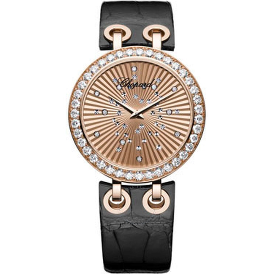 18 kt rose gold case with a black leather strap. Fixed 18 kt rose gold bezel set with diamonds. Rose gold dial with diamonds with rose gold-tone hands. Dial Type: Analog. Quartz movement. Scratch resistant sapphire crystal. Case diameter: 36 mm. Round case shape. Water resistant at 30 meters / 100 feet. Functions: hour, minute. Luxury watch style. Watch label: Swiss Made. Chopard Xtravaganza Diamond 18k Rose Gold Black Leather Ladies Watch 134236-5001. GENERAL Color: Black / Gold / Rose INFORMATION Brand: Chopard Series: Xtravaganza Collection Name: Xtravaganza Gender: Womens Model: 134236-5001 Watch Label: Swiss Made Movement: Quartz CASE Case Size: 36 mm Case Material: 18kt Rose Gold Case Shape: Round BAND Band Material: Leather Band Type: Strap Band Color: Black Clasp: Tang DIAL Dial Color: Rose Gold dial with diamonds Type: Analog Crystal: Scratch Resistant Sapphire Hands: Rose Gold-tone Bezel: Fixed 18k rose gold set with diamonds FEATURES Water Resistance: 30 meters / 100 feet Functions: Hour, Minute Watch Features: Diamond, Leather, Gold, Analog ADDITIONAL INFO Watch Style: Luxury Warranty: 2 Year Jomashop Warranty Jomashop Sku: CP134236-5001 Item Variation: 134236 5001, 134236.5001, 1342365001 Department: Watches Category: Watches