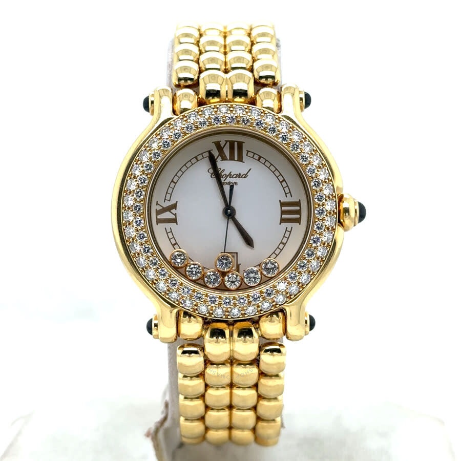 Yellow gold-tone 18kt yellow gold case and bracelet. Fixed yellow gold-tone bezel with diamond set 18kt yellow gold. White dial with yellow gold-tone hands and Roman numeral hour markers. Minute markers around the outer rim. Dial Type: Analog. Date display at the 6 o'clock position. 7 floating diamonds subdials. Quartz movement. Scratch resistant sapphire crystal. Pull / push crown. Solid case back. Round case shape, case size: 32 mm, case thickness: 10 mm. Band width: 15 mm. Hidden clasp. Water resistant at 30 meters / 100 feet. Functions: date, hour, minute, second. Happy Sport Series. Luxury watch style. Watch label: Swiss Made. Pre-owned Chopard Happy Sport Quartz Diamond White Dial Ladies Watch 27/6145-23. GENERAL Collection Name: Happy Sport INFORMATION Brand: Chopard Series: Happy Sport Model: 27/6145-23 Gender: Womens Watch Label: Swiss Made Movement: Quartz CONDITION INFORMATION Box: No Preowned Item Condition: Excellent Papers: Yes CASE Case Size: 32 mm Case Thickness: 10 mm Case Material: 18kt Yellow Gold Case Shape: Round Case Back: Solid DIAL Type: Analog Dial Color: White Crystal: Scratch Resistant Sapphire Hands: Yellow Gold-tone Second Markers: Minute Markers around the outer rim Dial Markers: Roman Numeral Sub Dials: 7 Floating Diamonds Bezel: Fixed Bezel Color: Yellow Gold-tone Bezel Material: Diamond Set 18kt Yellow Gold Crown: Pull / Push BAND Band Type: Bracelet Band Material: 18kt Yellow Gold Band Color: Yellow Gold-tone Band Width: 15 mm Clasp: Hidden FEATURES Water Resistance: 30 meters / 100 feet Calendar: Date display at the 6 o'clock position Functions: Date, Hour, Minute, Second Watch Features: Diamond, Gold, Analog ADDITIONAL INFO Watch Style: Luxury Warranty: 1 Year Jomashop Warranty Jomashop Sku: PRE-P-CP78675 Department: Watches