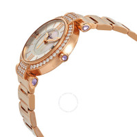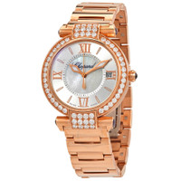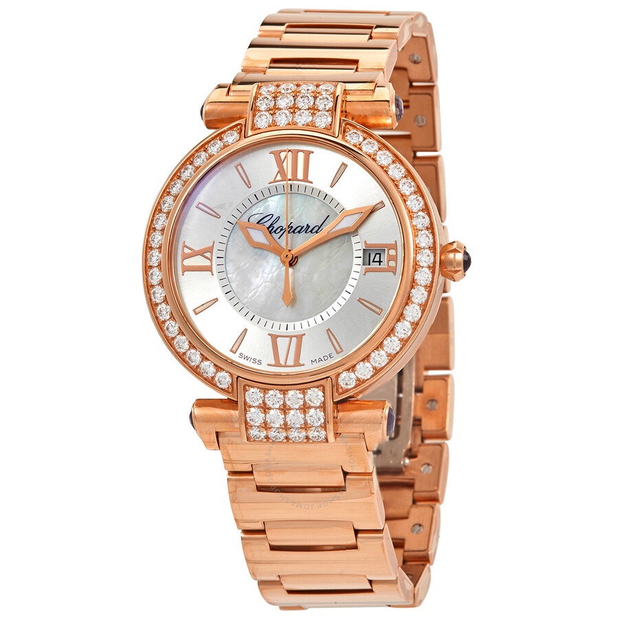 Pre-owned 18kt rose gold case with a 18kt rose gold bracelet. Diamond-set lugs. Fixed 18kt rose gold bezel set with diamonds. Silver dial with mother of pearl center with luminous rose gold hands and index hour markers. Roman numerals mark the 3, 6, 9 and 12 o'clock positions. Minute markers around an inner ring. Dial Type: Analog. Luminescent hands. Date display at the 3 o'clock position. Automatic movement. Scratch resistant sapphire crystal. Pull / push crown. Transparent case back. Case diameter: 36 mm. Round case shape. Band width: 17.8 mm. Band length: 7 inches. Hidden fold over clasp. Water resistant at 30 meters / 100 feet. Functions: date, hour, minute, second. Luxury watch style. Watch label: Swiss Made. Item Variations: 384822 5004, 384822.5004, 3848225004. Chopard Imperiale Silver Outer Dial with Mother of Pearl Center 18kt Rose Gold Ladies Watch 384822-5004. GENERAL Collection Name: Imperiale INFORMATION Brand: Chopard Series: Imperiale Model: 384822-5004 Gender: Womens Watch Label: Swiss Made Movement: Automatic Power Reserve: 42 hours CONDITION INFORMATION Box: No Preowned Item Condition: Excellent Papers: Yes CASE Case Size: 36 Case Material: 18kt Rose Gold Case Shape: Round Case Back: Transparent DIAL Type: Analog Dial Color: Silver with Mother of Pearl Center Crystal: Scratch Resistant Sapphire Hands: Luminous Rose Gold Second Markers: Roman Numerals mark the 3, 6, 9 and 12 o'clock positions. Minute Markers around an inner ring Dial Markers: Index Luminiscence: Hands Bezel: Fixed Bezel Material: 18kt Rose Gold set with Diamonds Crown: Pull / Push BAND Band Type: Bracelet Band Material: 18kt Rose Gold Band Width: 17.8 mm Clasp: Hidden Fold Over FEATURES Water Resistance: 30 meters / 100 feet Calendar: Date display at the 3 o'clock position Functions: Date, Hour, Minute, Second Watch Features: Analog, Gold, Diamond ADDITIONAL INFO Watch Style: Luxury Warranty: 1 Year Jomashop Warranty Jomashop Sku: PRE-P-CP95925 Department: Watches