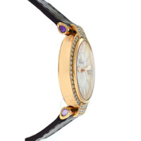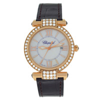 Pre-owned 18 kt rose gold case with a brown alligator leather strap. Fixed 18 kt rose gold bezel set with 60 diamonds (0.87 ct). Mother of pearl dial with rose gold-tone hands and stick hour markers. Roman numerals mark the 3, 6, 9 and 12 o'clock positions. Minute markers around an inner ring. Dial Type: Analog. Luminescent hands and markers. Date display appears at the 3 o'clock position. Quartz movement. Scratch resistant sapphire crystal. Solid case back. Case diameter: 28 mm. Case thickness: 9 mm. Round case shape. Tang clasp. Water resistant at 50 meters / 165 feet. Functions: date, hour, minute, second. Luxury watch style. Watch label: Swiss Made. Chopard Imperiale Diamond Mother of Pearl Dial 18 kt Rose Gold Ladies Watch 384238-5003. GENERAL Collection Name: Imperiale INFORMATION Brand: Chopard Series: Imperiale Model: 384238-5003 Gender: Womens Watch Label: Swiss Made Movement: Quartz CONDITION INFORMATION Box: Yes Preowned Item Condition: Excellent Papers: Yes Comments: The watch is near to min condition, might have some extremely light scratches at the back case, visible only under a close-up inspection. CASE Case Size: 28 mm Case Thickness: 9 mm Case Material: 18kt Rose Gold Case Shape: Round Case Back: Solid DIAL Type: Analog Dial Color: Mother of Pearl Crystal: Scratch Resistant Sapphire Hands: Rose Gold-tone Second Markers: Roman numerals mark the 3, 6, 9 and 12 o'clock positions. Minute Markers around an inner ring Dial Markers: Stick Luminiscence: Hands and Markers Bezel: Fixed 18 kt Rose gold set with 60 diamonds ( BAND Band Type: Strap Band Material: Leather Band Color: Brown Clasp: Tang FEATURES Water Resistance: 50 meters / 165 feet Calendar: Date display at the 3 o'clock position Functions: Date, Hour, Minute, Second Watch Features: Alligator Leather, Analog, Gold, Leather, Diamond ADDITIONAL INFO Watch Style: Luxury Warranty: 1 Year Jomashop Warranty Jomashop Sku: PRE-P-CP63075 Department: Watches Category: Watches