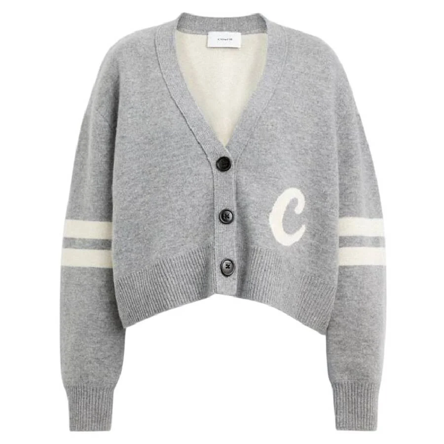 Coach Ladies Tops. Fashion category: T-Shirts & Henleys. SKU: CT061 NZ2. Color: Gray. Coach Cropped Scrip Logo Cardigan. This cardigan features a button closure, long sleeves, ribbed cuffs and hem, and is inspired by sporty vintage styles, with a detailed cursive "C" on the front, finished with a V-neckline. 43% Cotton, 39% Wool, 13% Cashmere, 4% Polyamide, 1% Elastane GENERAL Size Info: Large Brand Type: Designer Clothing Size: Ladies Apparel Size: L Color: Gray INFORMATION Brand: Coach Gender: Womens Model: CT061 NZ2 DETAILS Category: Tops Apparel Type: T-Shirts & Henleys Material: Cashmere, Cotton, Polyamide, Wool ADDITIONAL INFO UPC Code: 196395340606 Jomashop Sku: Z-2289Q Department: Clothing