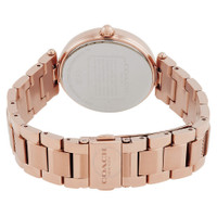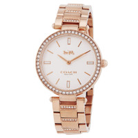 Pale rose gold-tone stainless steel case and bracelet. Fixed pale rose gold-tone bezel with crystal set. White dial with pale rose gold-tone hands and index-crystal hour markers. Crystal marker appears at the 3, 6, 9 and 12 o'clock positons. Dial Type: Analog. Quartz movement. Scratch resistant mineral crystal. Pull / push crown. Solid case back. Round case shape, case size: 34 mm. Fold over clasp with a safety release. Water resistant at 30 meters / 100 feet. Functions: hour, minute. Park Series. Casual watch style. Coach Park Quartz Crystal White Dial Ladies Watch 14503094. CASE Case Size: 34 Case Material: Stainless Steel Case Shape: Round Case Back: Solid BAND Band Material: Stainless Steel Band Type: Bracelet Band Color: Pale Rose Gold-tone Clasp: Fold Over with Safety Release DIAL Dial Color: White Type: Analog Crystal: Scratch Resistant Mineral Hands: Pale Rose Gold-tone Dial Markers: Index-Crystal Second Markers: Crystal Marker appears at the 3, 6, 9 and 12 o'clock positons Bezel: Fixed Bezel Color: Pale Rose Gold-tone Bezel Material: Crystal Set Crown: Pull / Push INFORMATION Brand: Coach Series: Park Collection Name: Park Gender: Womens Model: 14503094 Movement: Quartz FEATURES Water Resistance: 30 meters / 100 feet Functions: Hour, Minute Watch Features: Stainless Steel, Gold, Analog ADDITIONAL INFO Watch Style: Casual Warranty: 2 Year Jomashop Warranty Jomashop Sku: CC14503094 Department: Watches
