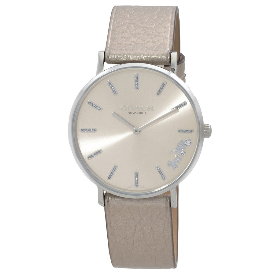 Silver-tone stainless steel case with a champagne metallic leather strap. Fixed silver-tone stainless steel bezel. Champagne dial with silver-tone hands and index hour markers. Dial Type: Analog. Quartz movement. Scratch resistant mineral crystal. Pull / push crown. Solid case back. Round case shape, case size: 36 mm. Buckle clasp. Water resistant at 30 meters / 100 feet. Functions: hour, minute. Perry Series. Casual watch style. Coach Perry Quartz Champagne Dial Ladies Watch 14503853. GENERAL Box Type: Original Box Brand Type: Designer CASE Case Size: 36 Case Material: Stainless Steel Case Shape: Round Case Back: Solid BAND Band Material: Leather Band Type: Strap Band Color: Champagne Metallic Clasp: Buckle DIAL Dial Color: Champagne Type: Analog Crystal: Scratch Resistant Mineral Hands: Silver-tone Dial Markers: Index Bezel: Fixed Bezel Color: Silver-tone Bezel Material: Stainless Steel Crown: Pull / Push INFORMATION Brand: Coach Series: Perry Collection Name: PERRY Gender: Womens Model: 14503853 Movement: Quartz FEATURES Water Resistance: 30 meters / 100 feet Functions: Hour, Minute Watch Features: Analog, Leather, Stainless Steel ADDITIONAL INFO Watch Style: Casual Warranty: 2 Year Jomashop Warranty Jomashop Sku: CC14503853 Department: Watches Category: Watches