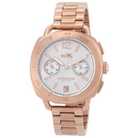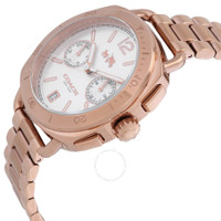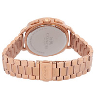Rose gold-tone stainless steel case and bracelet. Rose gold-tone stainless steel bezel. Silver dial with luminious rose gold-tone hands and index-Arabic numeral hour markers. Arabic numeral at the 12 o' clock position. Dial Type: Analog. Luminescent hands and markers. Date display at the 6 o'clock position. Two sub-dials displaying: 24 hours. Quartz movement. Solid case back. Round case shape, case size: 38 mm. Fold over clasp. Functions: date, hour, minute, second. Tatum Series. Casual watch style. Watch label: Japan Movt. Coach Tatum Quartz Silver Dial Ladies Watch 14502604. GENERAL Box Type: Original Box Brand Type: Designer CASE Case Size: 38 Case Material: Stainless Steel Case Shape: Round Case Back: Solid BAND Band Material: Stainless Steel Band Type: Bracelet Band Color: Rose Gold-tone Clasp: Fold Over DIAL Dial Color: Silver Type: Analog Hands: Luminious Rose Gold-tone Dial Markers: Index-Arabic Numeral Second Markers: Arabic Numeral at the 12 o' clock position Sub Dials: Two - 24 Hours Luminiscence: Hands and Markers Bezel Color: Rose Gold-tone Bezel Material: Stainless Steel INFORMATION Brand: Coach Series: Tatum Collection Name: Tatum Gender: Womens Model: 14502604 Watch Label: Japan Movt Movement: Quartz FEATURES Calendar: Date display at the 6 o'clock position Functions: Date, Hour, Minute, Second Watch Features: Analog, Gold, Stainless Steel ADDITIONAL INFO Watch Style: Casual Warranty: 2 Year Jomashop Warranty Jomashop Sku: CC14502604 Department: Watches Category: Watches