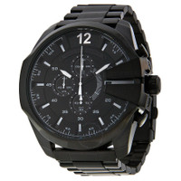 Black ion-plated stainless steel case and bracelet. Fixed black ion-plated bezel. Black dial with luminous silver-tone hands and index hour markers. An Arabic numeral marks the 12 o'clock position. Arabic numeral minute markers (at 5 minute intervals). Minute markers around the outer rim. Dial Type: Analog. Luminescent hands and markers. Date display at the 3 o'clock position. Chronograph - three sub-dials displaying: 60 second, 60 minute and 1/10th of a second. Quartz movement. Scratch resistant mineral crystal. Pull / push crown. Solid case back. Case dimensions: 59 mm x 51 mm. Case thickness: 15 mm. Round case shape. Band width: 24 mm. Band length: 8.5 inches. Tang clasp. Water resistant at 50 meters / 165 feet. Functions: chronograph, date, hour, minute, second. Casual watch style. Diesel Mega Chief Chronograph Black Dial Black Ion-plated Men's Watch DZ4283. INFORMATION Brand: Diesel Series: Mega Chief Collection Name: Mega Chief Gender: Mens Model: DZ4283 Movement: Quartz CASE Case Size: 59 mm x 51 mm Case Thickness: 15 mm Case Material: Stainless Steel Case Shape: Round Case Back: Solid BAND Band Material: Stainless Steel Band Type: Bracelet Band Color: Black Ion-plated Band Length: 8.5 inches Band Width: 24 mm Clasp: Tang DIAL Dial Color: Black Type: Analog Crystal: Scratch Resistant Mineral Hands: Luminous Silver-tone Dial Markers: Index Second Markers: Arabic Numeral marks the 12 o'clock position. Minute Markers around the outer rim Sub Dials: Three - 60 Second, 60 Minute and 1/10th of a Second Luminiscence: Hands and Markers Bezel: Fixed Bezel Color: Black Ion-plated Bezel Material: Stainless Steel Crown: Pull / Push FEATURES Water Resistance: 50 meters / 165 feet Calendar: Date display at the 3 o'clock position Functions: Chronograph, Date, Hour, Minute, Second Watch Features: Chronograph, Stainless Steel, Analog ADDITIONAL INFO Watch Style: Casual Warranty: 2 Year Jomashop Warranty UPC Code: 698615086573 Jomashop Sku: DZ4283 Department: Watches Category: Watches