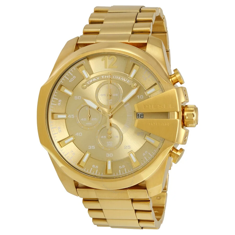 Gold- tone stainless steel case and bracelet. Fixed gold-tone bezel. Champange dial with luminous gold-tone hands and index hour markers. An Arabic numeral appears at the 12 o'clock position. Arabic numeral minute markers (at 5 minute intervals). Minute Markers around the outer rim. Dial Type: Analog. Luminescent hands and markers. Date display at the 3 o'clock position. Chronograph - three sub-dials displaying: 60 second, 60 minute and 1/10th of a second. Quartz movement. Scratch resistant mineral crystal. Pull / push crown. Solid case back. Case dimensions: 51 mm x 59 mm. Case thickness: 12 mm. Round case shape. Band width: 26 mm. Band length: 9 inches. Deployment clasp with a push button release. Water resistant at 100 meters / 330 feet. Functions: chronograph, date, hour, minute, second. Sport watch style. Diesel Mega Chief Chronograph Champagne Dial Men's Watch DZ4360 GENERAL Box Type: Original Box Brand Type: Designer CASE Case Diameter: 51 mm Case Thickness: 12 mm Case Color: Gold-Tone Case Material: Stainless Steel Case Shape: Round Case Back: Solid BAND Band Material: Stainless Steel Band Type: Bracelet Band Color: Gold-tone Band Length: 9 inches Band Width: 26 mm Clasp: Deployment with Push Button Release DIAL Dial Color: Champange Type: Analog Crystal: Scratch Resistant Mineral Hands: Luminous Gold-tone Dial Markers: Index Second Markers: Arabic Numeral appears at the 12 o'clock position. Minute Markers around the outer rim Sub Dials: Three - 60 Second, 60 Minute and 1/10th of a Second Luminiscence: Hands and Markers Bezel: Fixed Bezel Color: Gold-tone Bezel Material: Stainless Steel Crown: Pull / Push INFORMATION Brand: Diesel Series: Mega Chief Collection Name: Mega Chief Gender: Mens Model: DZ4360 Movement: Quartz FEATURES Water Resistance: 100 meters / 330 feet Calendar: Date display at the 3 o'clock position Functions: Chronograph, Date, Hour, Minute, Second Watch Features: Analog, Gold, Stainless Steel, Chronograph ADDITIONAL INFO Watch Style: Sport Warranty: 2 Year Jomashop Warranty UPC Code: 698615105977 Jomashop Sku: DZ4360 Department: Watches Category: Watches