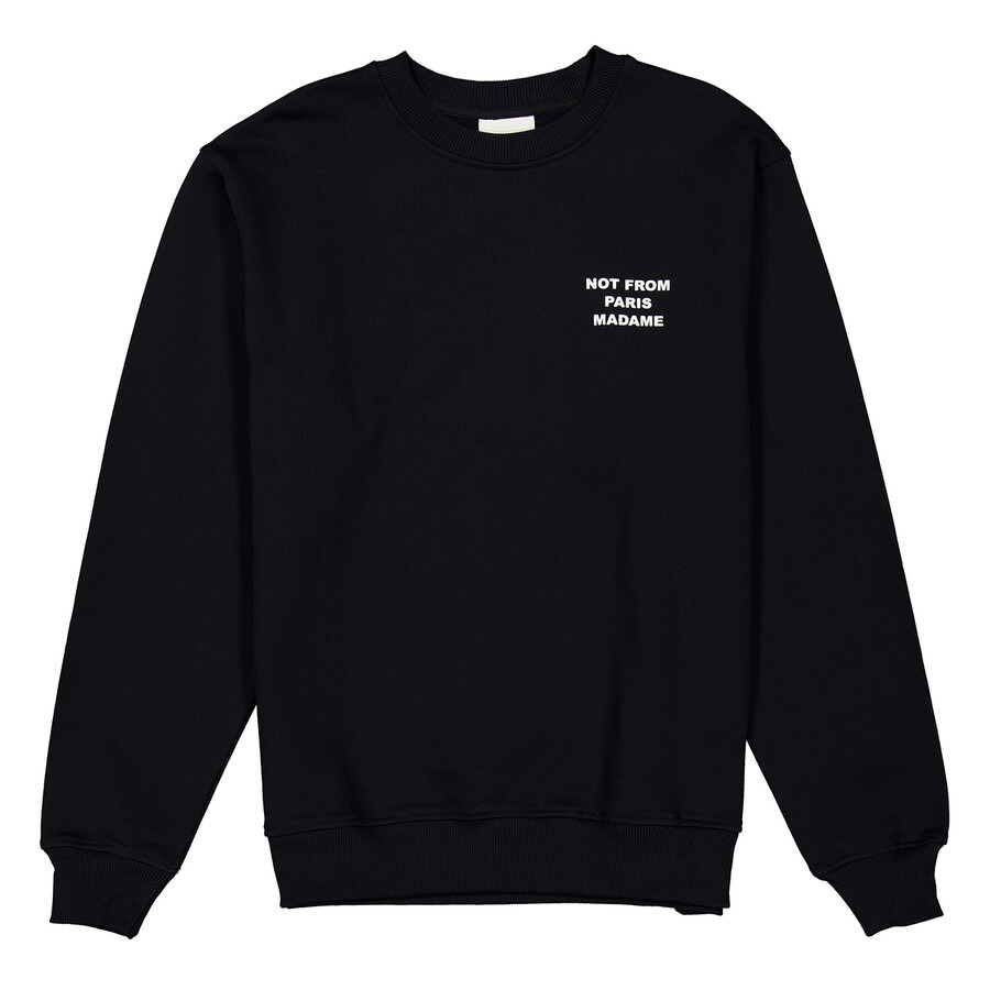 Drole De Monsieur Men's Tops. Fashion category: Hoodies & Sweatshirts. SKU: PERM-SW149-CO127-BL-BLACK. Color: Black. Drole De Monsieur Men's Black Slogan Le Sweatshirt. Crafted from cotton French terry, this sweatshirt features a ribbed hem and cuffs, with the 'Not from Paris Madame' slogan printed on the front and embroidered on the back. It offers a round collar and a comfortable fit, making it a stylish and casual piece for everyday wear. 100% cotton. GENERAL Color: Black INFORMATION Brand: Drole De Monsieur Gender: Mens Model: PERM-SW149-CO127-BL-BLACK DETAILS Category: Tops Apparel Type: Hoodies & Sweatshirts Material: Cotton ADDITIONAL INFO Jomashop Sku: -RMSW149CO127BLBLACK Department: Clothing