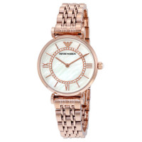 Rose gold-tone stainless steel case and bracelet. Fixed rose gold-tone bezel. Mother of pearl dial set with one rows of crystals with rose gold-tone hands and index hour markers. Roman numerals mark the 3, 6 and 9 o'clock positions. The Emporio Armani logo appears at the 12 o'clock position. Dial Type: Analog. Quartz movement. Scratch resistant mineral crystal. Pull / push crown. Solid case back. Case diameter: 32 mm. Case thickness: 8 mm. Round case shape. Band width: 14 mm. Deployment clasp. Water resistant at 30 meters / 100 feet. Functions: hour, minute. Casual watch style. Emporio Armani Classic Mother of Pearl Dial Rose Gold-tone Stainless Steel Ladies Watch AR1909. GENERAL Box Type: Original Box Brand Type: Designer CASE Case Diameter: 32 mm Case Thickness: 8 mm Case Material: Stainless Steel Case Shape: Round Case Back: Solid BAND Band Material: Stainless Steel Band Type: Bracelet Band Color: Rose Gold-tone Band Width: 14 mm Clasp: Deployment DIAL Dial Color: Mother of Pearl set with one rows of crystals Type: Analog Crystal: Scratch Resistant Mineral Hands: Rose Gold-tone Dial Markers: Index Second Markers: Roman Numerals mark the 3, 6 and 9 o'clock positions Bezel: Fixed Bezel Color: Rose Gold-tone Bezel Material: Stainless Steel Crown: Pull / Push INFORMATION Brand: Emporio Armani Series: Classic Fusion Collection Name: Classic Gender: Womens Model: AR1909 Movement: Quartz FEATURES Water Resistance: 30 meters / 100 feet Functions: Hour, Minute Watch Features: Analog, Gold, Stainless Steel ADDITIONAL INFO Watch Style: Casual Warranty: 2 Year Jomashop Warranty UPC Code: 723763231619 Jomashop Sku: AR1909 Department: Watches Category: Watches