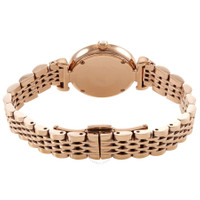 Rose gold-tone stainless steel case and bracelet. Fixed rose gold-tone bezel. Mother of pearl dial with rose gold-tone hands and crystral-set index hour markers. Roman numerals appear at the 3, 6 and 9 o'clock positions. The Emporio Armani Eagle appears at the 12 o'clock position. Dial Type: Analog. Quartz movement. Scratch resistant mineral crystal. Pull / push crown. Solid case back. Round case shape. Case size: 28 mm. Case thickness: 7 mm. Band width: 12 mm. Butterfly clasp. Water resistant at 30 meters / 100 feet. Functions: hour, minute. Gianni T-bar Series. Casual watch style. Emporio Armani Gianni T-Bar Quartz Crystal Ladies Watch AR11316. CASE Case Size: 28 Case Thickness: 7 mm Case Material: Stainless Steel Case Shape: Round Case Back: Solid BAND Band Material: Stainless Steel Band Type: Bracelet Band Color: Rose Gold-tone Band Width: 12 mm Clasp: Butterfly DIAL Dial Color: Mother of Pearl Type: Analog Crystal: Scratch Resistant Mineral Hands: Rose Gold-tone Dial Markers: Crystral-set Index Second Markers: Roman Numerals appear at the 3, 6 and 9 o'clock positions Bezel: Fixed Bezel Color: Rose Gold-tone Crown: Pull / Push INFORMATION Brand: Emporio Armani Series: Gianni T-Bar Collection Name: Gianni T-Bar Gender: Womens Model: AR11316 Movement: Quartz FEATURES Water Resistance: 30 meters / 100 feet Functions: Hour, Minute Watch Features: Analog, Gold, Stainless Steel ADDITIONAL INFO Watch Style: Casual Warranty: 2 Year Jomashop Warranty UPC Code: 723763290463 Jomashop Sku: AR11316 Department: Watches Category: Watches