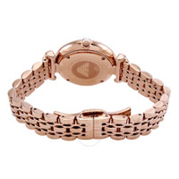 Rose gold-tone stainless steel case and bracelet. Fixed rose gold-tone bezel. Silver crystal pave dial with rose gold-tone hands and index hour markers. Roman numerals mark the 3, 6 and 9 o'clock position. Dial Type: Analog. Quartz movement. Scratch resistant sapphire crystal. Pull / push crown. Solid case back. Round case shape. Case size: 32 mm. Case thickness: 8 mm. Band width: 14 mm. Butterfly clasp. Water resistant at 30 meters / 100 feet. Functions: hour, minute, second. Glitz Series. Casual watch style. Emporio Armani Glitz Quartz Crystal Pave Dial Ladies Watch AR11244. INFORMATION Brand: Emporio Armani Series: Glitz Collection Name: Glitz Gender: Womens Model: AR11244 Movement: Quartz CASE Case Size: 32 mm Case Thickness: 8 mm Case Material: Stainless Steel Case Shape: Round Case Back: Solid BAND Band Material: Stainless Steel Band Type: Bracelet Band Color: Rose Gold-tone Band Width: 14 mm Clasp: Butterfly DIAL Dial Color: Silver Crystal Pave Type: Analog Crystal: Scratch Resistant Sapphire Hands: Rose Gold-tone Dial Markers: Index Second Markers: Roman Numerals mark the 3, 6 and 9 o'clock position Bezel: Fixed Bezel Color: Rose Gold-tone Bezel Material: Stainless Steel Crown: Pull / Push FEATURES Water Resistance: 30 meters / 100 feet Functions: Hour, Minute, Second Watch Features: Stainless Steel, Gold, Analog ADDITIONAL INFO Watch Style: Casual Warranty: 2 Year Jomashop Warranty UPC Code: 723763281065 Jomashop Sku: AR11244 Department: Watches Category: Watches