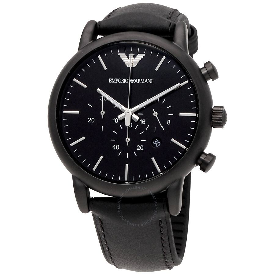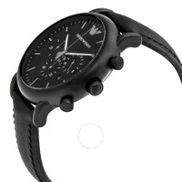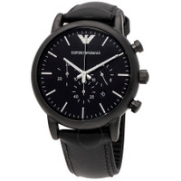 Black ion-plated stainless steel case with a black leather strap. Fixed black ion-plated bezel. Black dial with luminous silver-tone hands and index hour markers. Minute markers around the outer rim. The Emporio Armani logo appears the 12 o'clock position. Dial Type: Analog. Luminescent hands. Date display between the 4 and 5 o'clock positions. Chronograph - three sub-dials displaying: 60 second, 30 minute and 24 hour. Quartz movement. Scratch resistant mineral crystal. Pull / push crown. Solid case back. Case size: 46 mm. Case thickness: 13 mm. Round case shape. Band width: 21 mm. Tang clasp. Water resistant at 50 meters / 165 feet. Functions: chronograph, date, hour, minute, second. Additional Info: in general, suitable for short periods of recreational swimming, but not diving or snorkeling. Sport watch style. Emporio Armani Luigi Chronograph Black Dial Men's Watch AR1970. CASE Case Size: 46 Case Thickness: 13 mm Case Material: Stainless Steel Case Shape: Round Case Back: Solid BAND Band Material: Leather Band Type: Strap Band Color: Black Band Width: 21 mm Clasp: Tang DIAL Dial Color: Black Type: Analog Crystal: Scratch Resistant Mineral Hands: Luminous Silver-tone Dial Markers: Index Second Markers: Minute Markers around the outer rim Sub Dials: Three - 60 Second, 30 Minute and 24 Hour Luminiscence: Hands Bezel: Fixed Bezel Color: Black Ion-plated Bezel Material: Stainless Steel Crown: Pull / Push INFORMATION Brand: Emporio Armani Series: Luigi Collection Name: Luigi Gender: Mens Model: AR1970 Movement: Quartz FEATURES Water Resistance: 50 meters / 165 feet Calendar: Date display between 4 and 5 o'clock position Functions: Chronograph, Date, Hour, Minute, Second Watch Features: Analog, Leather, Stainless Steel, Chronograph ADDITIONAL INFO Watch Style: Sport Warranty: 2 Year Jomashop Warranty UPC Code: 723763241328 Additional Info: in General, Suitable for Short Periods Of Recreational Swimming, but not Diving or Snorkeling Jomashop Sku: AR1970 Department: Watches Category: Watches