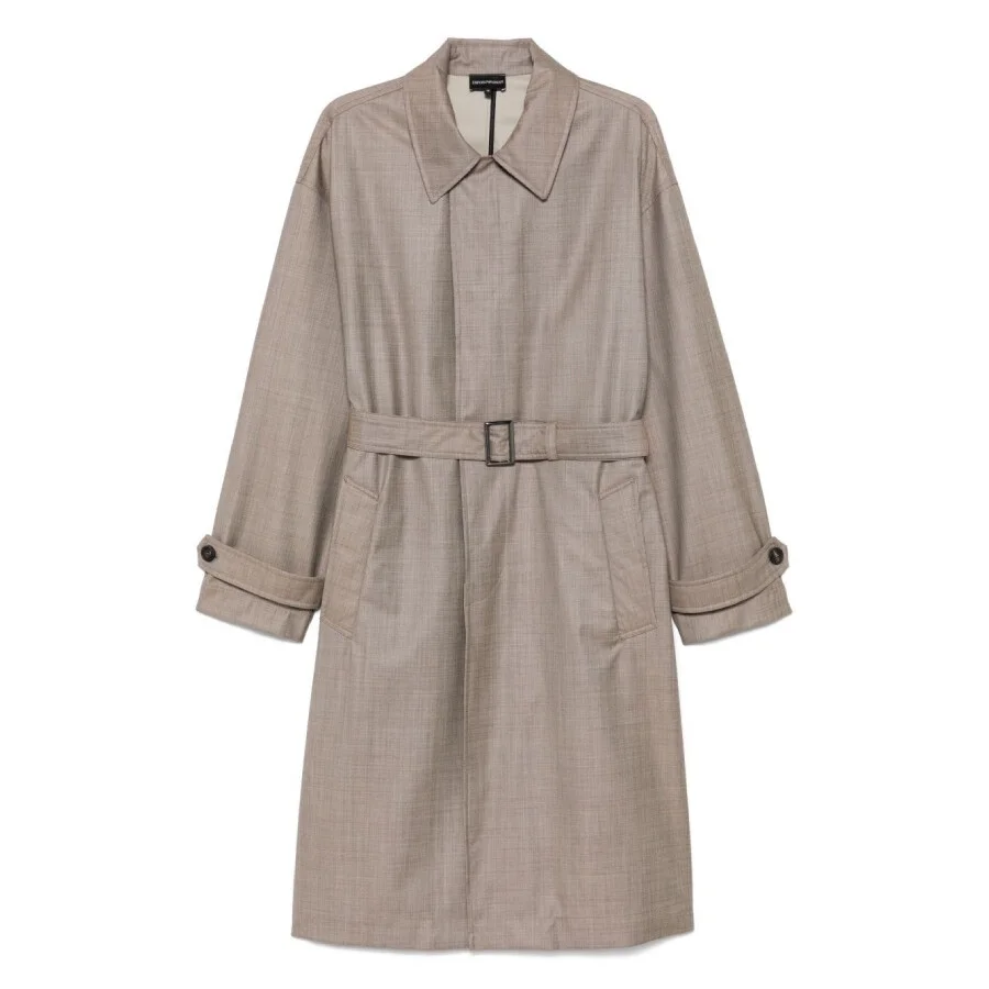 Emporio Armani Men's Outerwear. Fashion category: Coats & Jackets. SKU: EM000662-AF14151-F1046. Color: Beige Fancy. Emporio Armani Virgin-Wool Belted Trench Coat. This trench coat features a discreet concealed front button fastening, two tailored side welt pockets, a detachable and adjustable waist belt, and a central rear vent for a sophisticated, streamlined silhouette. 100% Wool. Made in Romania. GENERAL Brand Type: Designer Color: Beige Fancy INFORMATION Brand: Emporio Armani Gender: Mens Model: EM000662-AF14151-F1046 DETAILS Category: Outerwear Apparel Type: Coats & Jackets Material: Wool ADDITIONAL INFO Jomashop Sku: -M000662AF14151F1046 Department: Clothing