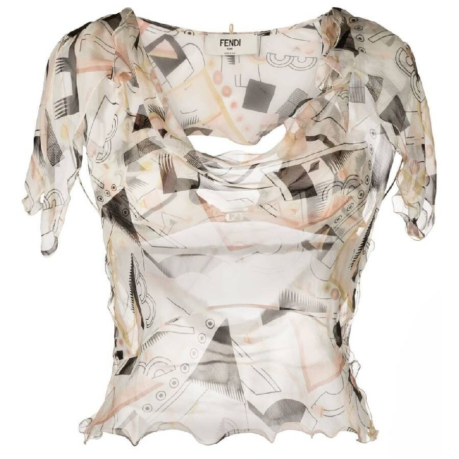 Fendi Ladies Tops. Fashion category: Shirts & Blouses. SKU: FS7563-AKSN-F1IHA. Color: Babe. Fendi Abstract Printed Chiffon Top. The cropped sleeveless top features a shoulder cape, a wide front neckline, and an open back with crossed laces. Made of light pink silk chiffon with an abstract geometric print in various shades, it is finished with small matching ruffles and comes with a coordinating print bra. 100% Silk, 100% Viscose. Made in Italy. GENERAL Color: Babe INFORMATION Brand: Fendi Gender: Womens Model: FS7563-AKSN-F1IHA DETAILS Category: Tops Apparel Type: Shirts & Blouses Material: Silk, Viscose ADDITIONAL INFO Jomashop Sku: -FS7563AKSNF1IHA Department: Clothing