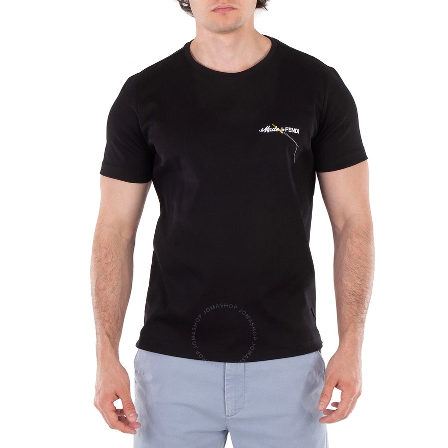 Fendi Men's Tops. Fashion category: T-Shirts & Henleys. SKU: FY0894-AR6W-F0QA1. Color: Black. Fendi Embroidered Logo Crew Neck T-Shirt. This t-shirt features a regular-fit, short-sleeve, crew-neck, decorated with an embroidered logo lettering on the chest and a straight hem. 100% cotton. Made in Italy. GENERAL Brand Type: Designer Color: Black INFORMATION Brand: Fendi Gender: Mens Model: FY0894-AR6W-F0QA1 DETAILS Category: Tops Apparel Type: T-Shirts & Henleys Material: Cotton ADDITIONAL INFO Jomashop Sku: -FY0894AR6WF0QA1 Department: Clothing