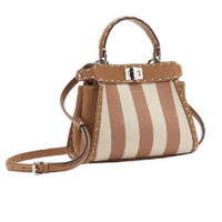 Fendi Ladies Handbag. SKU: 8BN244-AOVG-F1AOK. Color: Beige/Sand/Pal. Size: H 18 x D 11 x W 23 cm. The small iconic Peekaboo bag, crafted with 336 hand-sewn tone-on-tone macro topstitches showcasing Fendi's signature Selleria workmanship since 1925, features beige Pequin-striped jacquard fabric with beige Cuoio Romano leather trim, a jacquard fabric-lined interior with the FF motif, two compartments separated by a stiff leather partition, an internal pocket, a Selleria logo plate, and palladium-finish metalware, while its iconic twist lock, top handle, and adjustable, detachable shoulder strap allow for versatile carrying options. 55% polyamide, 45% cotton, 100% calfleather, inside:55%polyamide, 45%cotton. Made in Italy. GENERAL Size Info: H 18 x D 11 x W 23 cm Brand Type: Designer Color: Beige/Sand/Pal INFORMATION Brand: Fendi Gender: Womens Model: 8BN244-AOVG-F1AOK DETAILS Material: Cotton, Leather, Polyamide ADDITIONAL INFO UPC Code: 2004005600614 Jomashop Sku: Z-HYSVE Department: Bags Category: Top Handle Bag