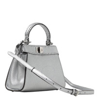 Fendi Ladies Handbag. SKU: 8BN244-ALVK-F0MK5. Color: Argento/Palladio. Size: H: 18 cm × D: 11 cm × W: 23 cm. Fendi Peekaboo Leather Handbag. This bag is crafted from Cuoio Romano leather, embellished with tone-on-tone hand stitching and designed with a twist lock on both sides. It features a lining with the Selleria stamp in leather, two internal compartments divided by a stiff partition, an inner zipper pocket, and palladium-finished hardware. 100% calf leather, inside: 100% sheep leather. Made in Italy. GENERAL Size Info: H: 18 cm × D: 11 cm × W: 23 cm Brand Type: Designer Color: Argento/Palladio INFORMATION Brand: Fendi Gender: Womens Model: 8BN244-ALVK-F0MK5 DETAILS Material: Leather ADDITIONAL INFO UPC Code: 2004005445390 Jomashop Sku: Z-75A87 Department: Bags Category: Handbag