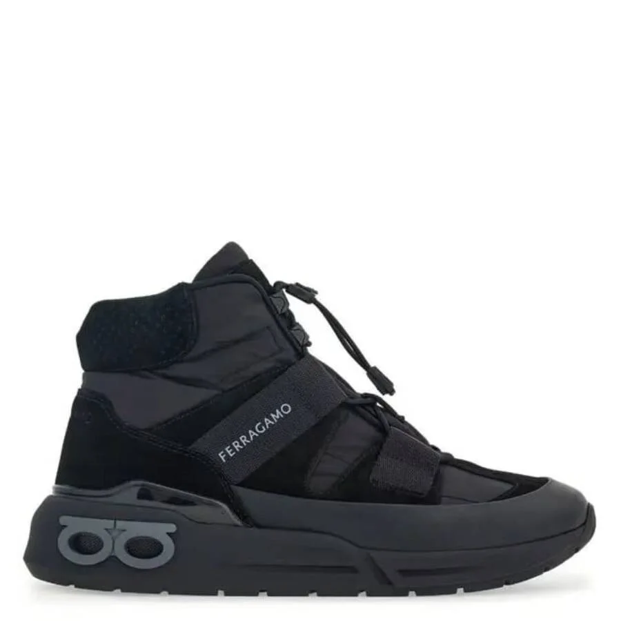 Ferragamo Ladies Sneakers. SKU: 030445 762925. Color: Black. Ferragamo Cosma High-Top Panelled Sneakers. A chunky, urban high-top sneaker blending ’90s inspiration with modern style. Crafted from technical fabric, it features toggle fastening, padded collar. The ultra-light rubber sole includes a heel spoiler and double Gancio-inspired side eyelets. Made in Italy. Please visit the brand website for sizing information. INFORMATION Brand: Ferragamo Model: 030445 762925 Gender: Womens DETAILS Category: Sneakers Color: Black Sole Material: Rubber ADDITIONAL INFO Jomashop Sku: -030445762925N Department: Shoes