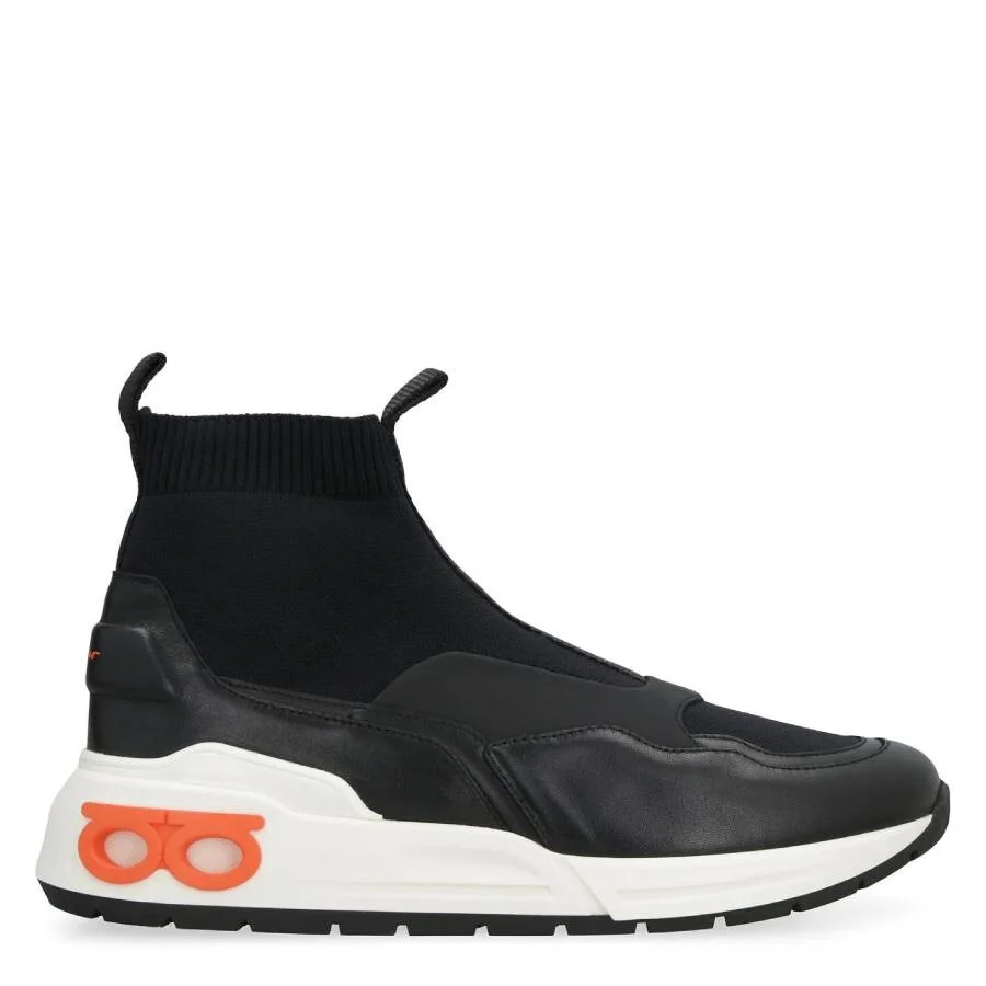 Ferragamo Ladies Sneakers. SKU: 030368 759688. Color: Black. Ferragamo Cosma Sock High-Top Sneakers. Black slip-on sock sneakers crafted from fabric, featuring an elasticated cuff, orange logo detail, and a contrasting white-and-black rubber sole. Designed for comfort with a modern high-top silhouette. Outer Layer: Fabric Leather. Inner Layer: Fabric. Sole: Rubber. Made in Italy. Please visit the brand website for sizing information. INFORMATION Brand: Ferragamo Model: 030368 759688 Gender: Womens DETAILS Category: Sneakers Shoe Style: High Tops Shoe Style: High Tops Color: Black Shoe Vamp Style: Slip-on Sole Material: Rubber ADDITIONAL INFO Jomashop Sku: -030368759688N Department: Shoes