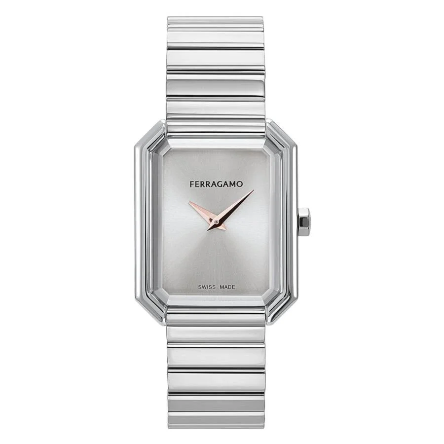 Silver-tone stainless steel case and bracelet. Fixed silver-tone stainless steel bezel. Silver sunray dial with rose gold-tone hands. No markers. Dial Type: Analog. Quartz movement. Scratch resistant sapphire crystal. Pull / push crown. Solid case back. Rectangle case shape, case size: 26.5 x 33.5 mm. Deployment with push button release clasp. Water resistant at 30 meters / 100 feet. Functions: hour, minute. Crystal Tank Series. Casual watch style. Watch label: Swiss Made. Ferragamo Crystal Tank Quartz Ladies Watch SFS800324. GENERAL Box Type: Original Box CASE Case Diameter: 26.5 x 33.5 mm Case Material: Stainless Steel Case Shape: Rectangle Case Back: Solid BAND Band Material: Stainless Steel Band Type: Bracelet Band Color: Silver-tone Clasp: Deployment with Push Button Release DIAL Dial Color: Silver Sunray Type: Analog Crystal: Scratch Resistant Sapphire Hands: Rose Gold-tone Second Markers: No Markers Bezel: Fixed Bezel Color: Silver-tone Bezel Material: Stainless Steel Crown: Pull / Push INFORMATION Brand: Ferragamo Series: Crystal Tank Collection Name: Crystal Tank Gender: Womens Model: SFS800324 Watch Label: Swiss Made Movement: Quartz FEATURES Water Resistance: 30 meters / 100 feet Functions: Hour, Minute Watch Features: Analog, Gold, Stainless Steel ADDITIONAL INFO Watch Style: Casual Warranty: 2 Year Jomashop Warranty Jomashop Sku: FR-SFS800324 Department: Watches