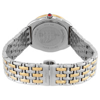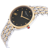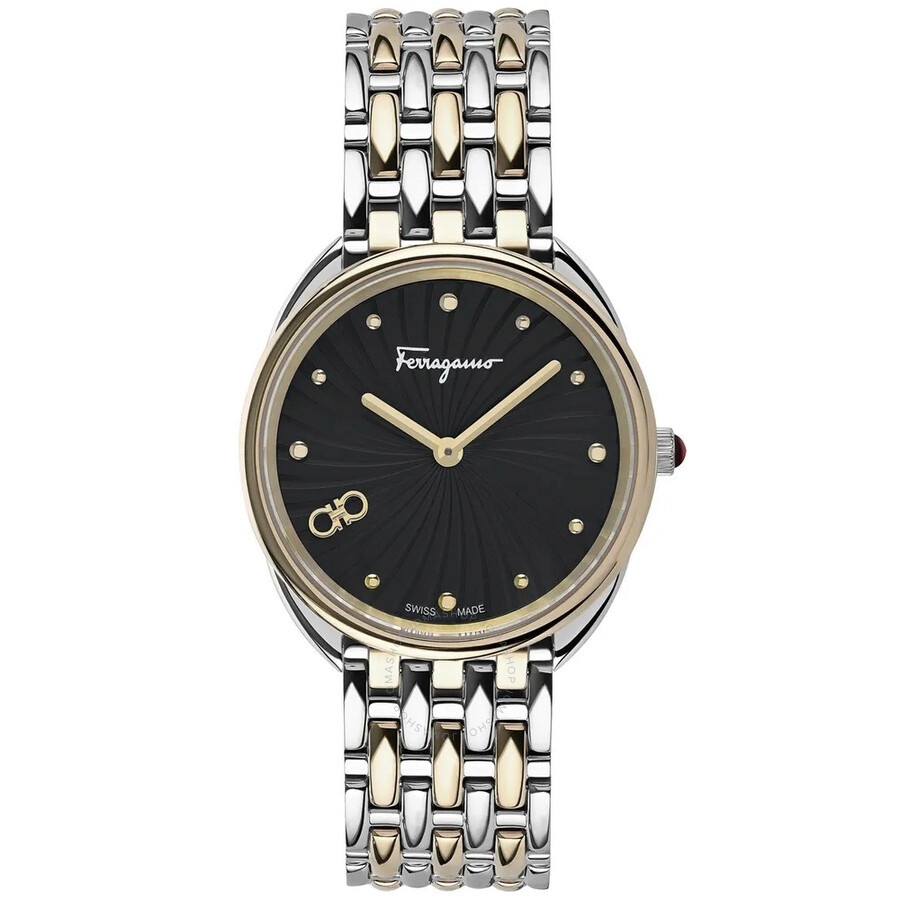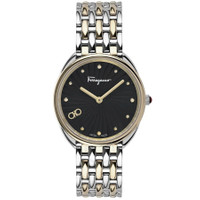 Silver-tone stainless steel case with a two-tone (silver-tone and gold-tone) stainless steel bracelet. Fixed gold-tone stainless steel bezel. Black guilloche dial with gold-tone hands and index hour markers. Dial Type: Analog. Quartz movement. Scratch resistant sapphire crystal. Pull / push crown. Solid case back. Round case shape, case size: 34 mm. Deployment clasp. Water resistant at 50 meters / 165 feet. Functions: hour, minute. Cuir Series. Casual watch style. Watch label: Swiss Made. Ferragamo Cuir Quartz Ladies Watch SFYN00820. CASE Case Size: 34 Case Material: Stainless Steel Case Shape: Round Case Back: Solid BAND Band Material: Stainless Steel Band Type: Bracelet Band Color: Two-tone (Silver-tone and Gold-tone) Clasp: Deployment DIAL Dial Color: Black Guilloché Type: Analog Crystal: Scratch Resistant Sapphire Hands: Gold-tone Dial Markers: Index Bezel: Fixed Bezel Color: Gold-tone Bezel Material: Stainless Steel Crown: Pull / Push INFORMATION Brand: Ferragamo Series: Cuir Collection Name: Cuir Gender: Womens Model: SFYN00820 Watch Label: Swiss Made Movement: Quartz FEATURES Water Resistance: 50 meters / 165 feet Functions: Hour, Minute Watch Features: Stainless Steel, Gold, Analog ADDITIONAL INFO Watch Style: Casual UPC Code: 7630030566981 Jomashop Sku: Z-YD84W Department: Watches