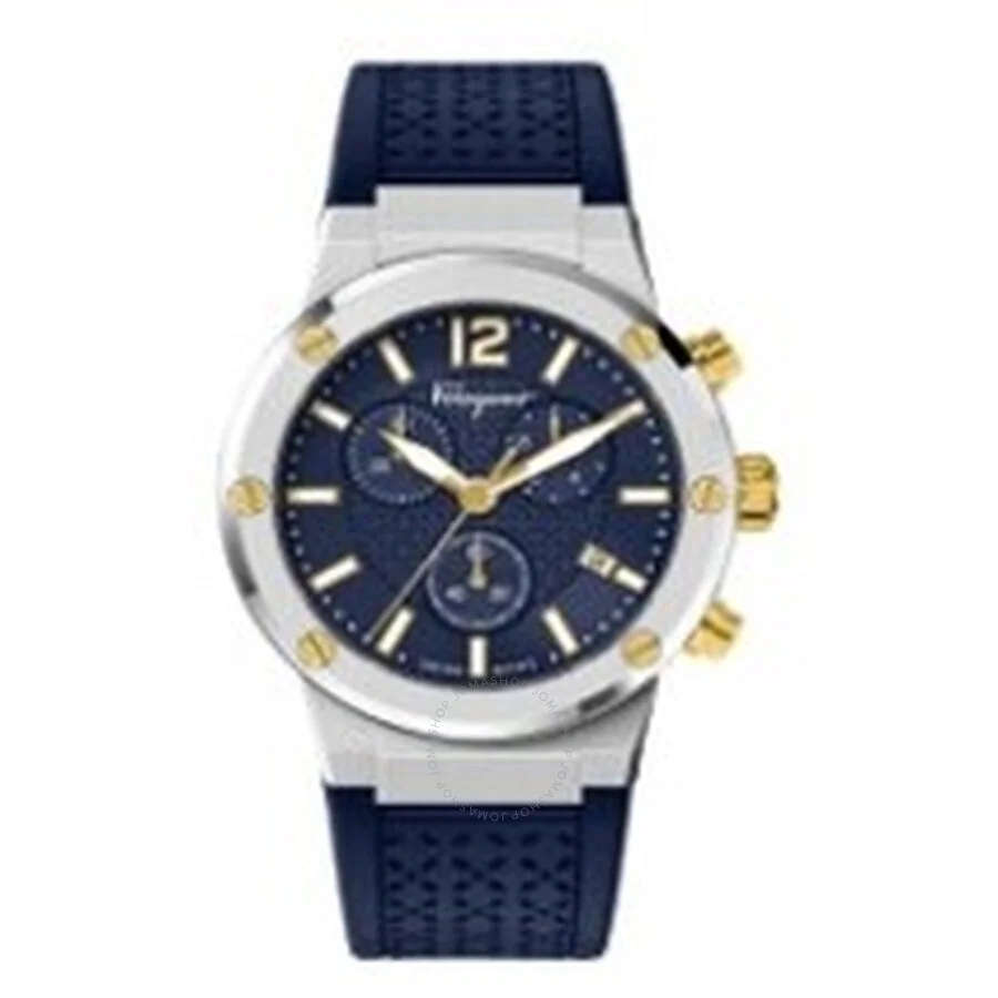 Silver-tone stainless steel case with a blue rubber strap. Fixed silver-tone stainless steel bezel. Blue dial with gold-tone hands and index hour markers. Arabic numeral appears at the 12 o'clock positions. Minute markers around the outer rim. Dial Type: Analog. Luminescent hands and markers. Date display at the 4 o'clock position. Chronograph - three sub-dials displaying: 60 second, 30 minute and 12 hour. Quartz movement. Scratch resistant sapphire crystal. Pull / push crown. Solid case back. Round case shape, case size: 42 mm. Deployment clasp. Water resistant at 50 meters / 165 feet. Functions: chronograph, date, hour, minute, second. F-80 Series. Sport watch style. Watch label: Swiss Made. Ferragamo F-80 Chronograph Quartz Blue Dial Men's Watch SFJE00724. GENERAL Box Type: Original Box CASE Case Size: 42 Case Material: Stainless Steel Case Shape: Round Case Back: Solid BAND Band Material: Rubber Band Type: Strap Band Color: Blue Clasp: Deployment DIAL Dial Color: Blue Type: Analog Crystal: Scratch Resistant Sapphire Hands: Gold-tone Dial Markers: Index Second Markers: Arabic Numeral appears at the 12 o'clock positions. Minute Markers around the outer rim Sub Dials: Three - 60 Second, 30 Minute and 12 Hour Luminiscence: Hands and Markers Bezel: Fixed Bezel Color: Silver-tone Bezel Material: Stainless Steel Crown: Pull / Push INFORMATION Brand: Ferragamo Series: F-80 Collection Name: F-80 Gender: Mens Model: SFJE00724 Watch Label: Swiss Made Movement: Quartz FEATURES Water Resistance: 50 meters / 165 feet Calendar: Date display at the 4 o'clock position Functions: Chronograph, Date, Hour, Minute, Second Watch Features: Analog, Gold, Rubber, Stainless Steel, Chronograph ADDITIONAL INFO Watch Style: Sport UPC Code: 7630615167404 Jomashop Sku: FR-SFJE00724 Department: Watches