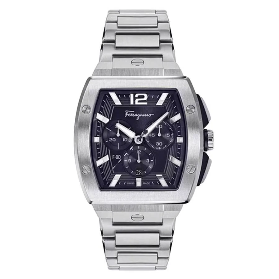 Silver-tone stainless steel case and bracelet. Fixed silver-tone stainless steel bezel. Blue dial with silver-tone hands and index-Arabic numeral hour markers. Arabic numeral marks the 12 o'clock position. Minute markers around the outer rim. Dial Type: Analog. Luminescent hands and markers. Date display at the 6 o'clock position. Chronograph - three sub-dials displaying: 60 second, 30 minute and 12 hour. Quartz movement. Scratch resistant sapphire crystal. Solid case back. Tonneau case shape, case size: 41.8 mm. Deployment with push button release clasp. Water resistant at 100 meters / 330 feet. Functions: chronograph, date, hour, minute, second. F-80 Series. Sport watch style. Watch label: Swiss Made. Ferragamo F-80 Chronograph Quartz Blue Dial Men's Watch SFKE00724. GENERAL Box Type: Original Box CASE Case Diameter: 41.8 mm Case Material: Stainless Steel Case Shape: Tonneau Case Back: Solid BAND Band Material: Stainless Steel Band Type: Bracelet Band Color: Silver-tone Clasp: Deployment with Push Button Release DIAL Dial Color: Blue Type: Analog Crystal: Scratch Resistant Sapphire Hands: Silver-tone Dial Markers: Index-Arabic Numeral Second Markers: Arabic Numeral Marks the 12 o'clock position. Minute Markers around the outer rim Sub Dials: Three - 60 Second, 30 Minute and 12 Hour Luminiscence: Hands and Markers Bezel: Fixed Bezel Color: Silver-tone Bezel Material: Stainless Steel INFORMATION Brand: Ferragamo Series: F-80 Collection Name: F-80 Gender: Mens Model: SFKE00724 Watch Label: Swiss Made Movement: Quartz FEATURES Water Resistance: 100 meters / 330 feet Calendar: Date display at the 6 o'clock position Functions: Chronograph, Date, Hour, Minute, Second Watch Features: Analog, Stainless Steel, Chronograph ADDITIONAL INFO Watch Style: Sport Warranty: 2 Year Jomashop Warranty Jomashop Sku: Z-PF6VA Department: Watches