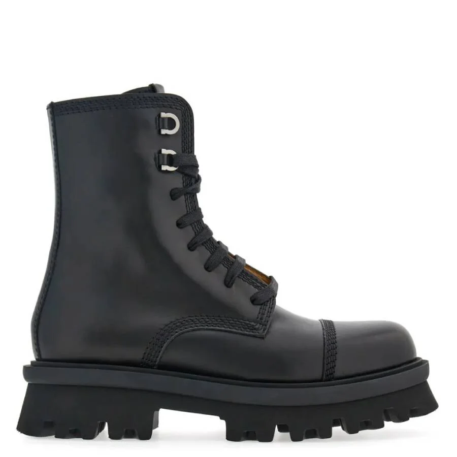 Ferragamo Men's Boots. Faraway series. SKU: 021494 763193. Color: Black. Ferragamo Faraway Chunky Combat Boots. A rugged combat boot with a rounded toe, defined by bold multi-row stitching. The lace-up design is finished with two signature Gancio eyelets at the top, while a chunky sole with a protruding welt and lug tread delivers grip, attitude, and modern edge. Material: Calfskin. Made in Italy. Please visit the brand website for sizing information. GENERAL Collection Name: Faraway INFORMATION Brand: Ferragamo Series: Faraway Model: 021494 763193 Gender: Mens DETAILS Category: Boots Shoe Style: Combat Boots Shoe Style: Combat Boots Color: Black Shoe Vamp Style: Lace-up Upper Material: Calfskin Sole Material: Rubber ADDITIONAL INFO Jomashop Sku: -021494763193N Department: Shoes