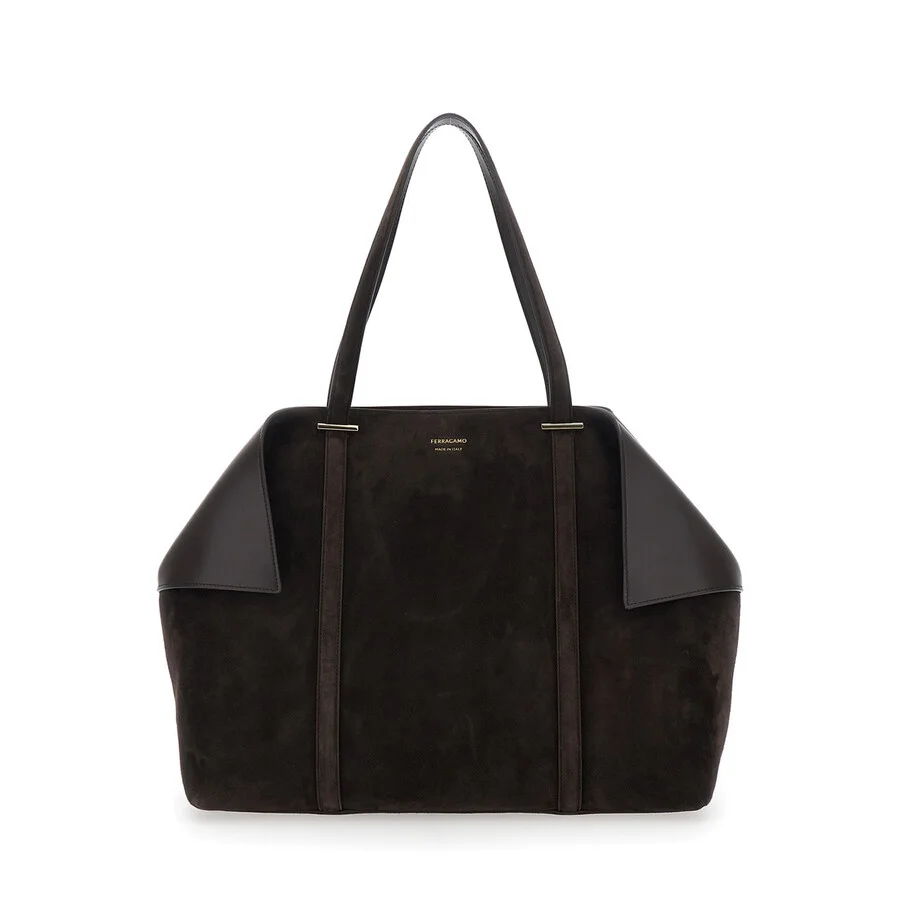 Ferragamo Ladies Tote. SKU: 21A452 0789602. Color: Brown. An elevated take on the iconic Ferragamo tote, crafted in supple calfskin suede for a refined, tactile finish. The folded silhouette reveals leather lining at the sides, enhancing its rich texture and understated elegance. Extended leather top handles run along the front panels and are accented with a minimalist rectangular gold-tone clasp. An embossed Ferragamo logo completes the design, creating a spacious yet ergonomic tote that sits comfortably against the body. Dimensions: 14.9" L × 11.8" H × 7.0" W. Handle Drop: 9.8" (25 cm). Material: Calfskin suede. Made in Italy. GENERAL Item Variation: 21A452 0789602, 789602TESTADIMORO Color: Brown INFORMATION Brand: Ferragamo Gender: Womens Model: 21A452 789602 ADDITIONAL INFO UPC Code: 8017577173718 Jomashop Sku: Z-URHNL Department: Bags Category: Tote Bags