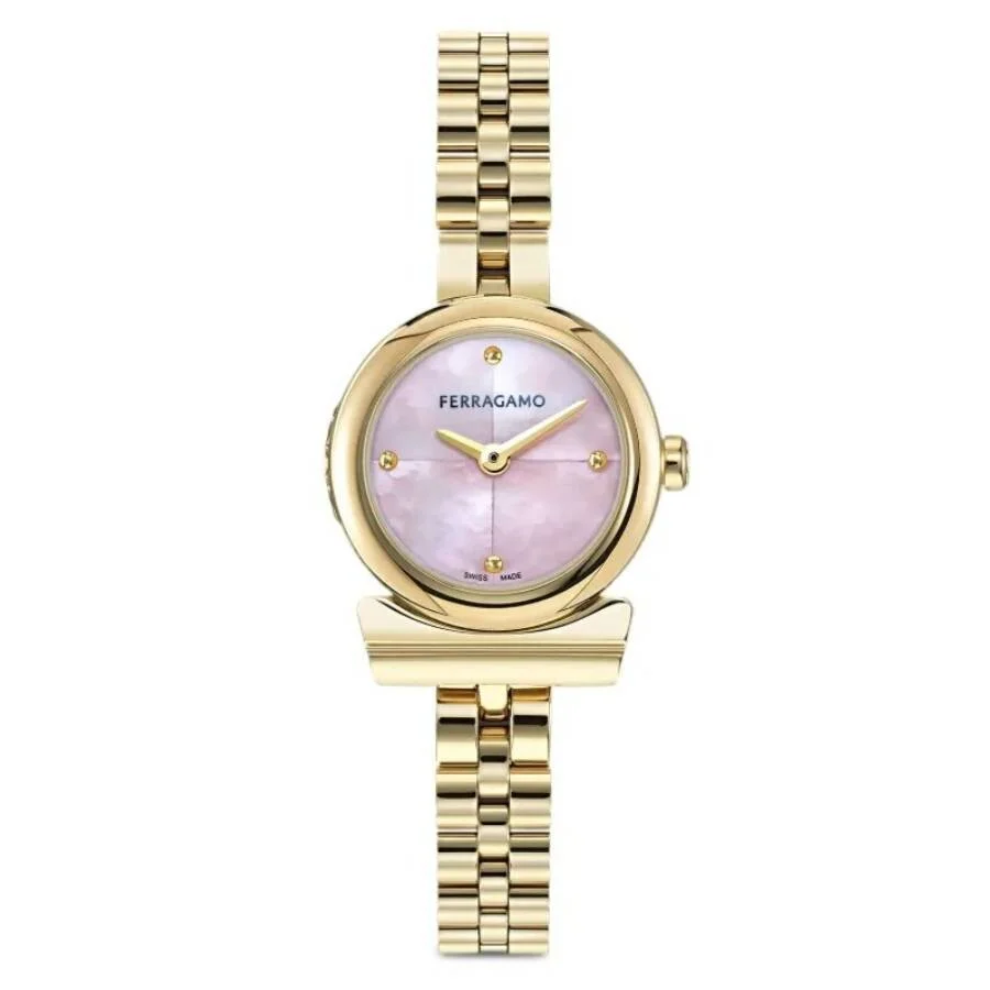 Gold-tone stainless steel case and bracelet. Fixed gold-tone stainless steel bezel. Pink dial with gold-tone hands and index hour markers. Dial Type: Analog. Quartz movement. Scratch resistant sapphire crystal. Pull / push crown. Solid case back. Round case shape, case size: 22.5 mm. Water resistant at 30 meters / 100 feet. Functions: hour, minute. Gancini Series. Dress watch style. Watch label: Japan Movt. Ferragamo Gancini Quartz Pink Dial Ladies Watch SFKK02324. GENERAL Box Type: Original Box CASE Case Material: Stainless Steel Case Shape: Round Case Back: Solid BAND Band Material: Stainless Steel Band Type: Bracelet Band Color: Gold-tone DIAL Dial Color: Pink Type: Analog Crystal: Scratch Resistant Sapphire Hands: Gold-tone Dial Markers: Index Bezel: Fixed Bezel Color: Gold-tone Bezel Material: Stainless Steel Crown: Pull / Push INFORMATION Brand: Ferragamo Series: Gancini Collection Name: Gancini Gender: Womens Model: SFKK02324 Watch Label: Japan Movt Movement: Quartz FEATURES Water Resistance: 30 meters / 100 feet Functions: Hour, Minute Watch Features: Analog, Gold, Stainless Steel ADDITIONAL INFO Watch Style: Dress Warranty: 2 Year Jomashop Warranty Jomashop Sku: FR-SFKK02324 Department: Watches