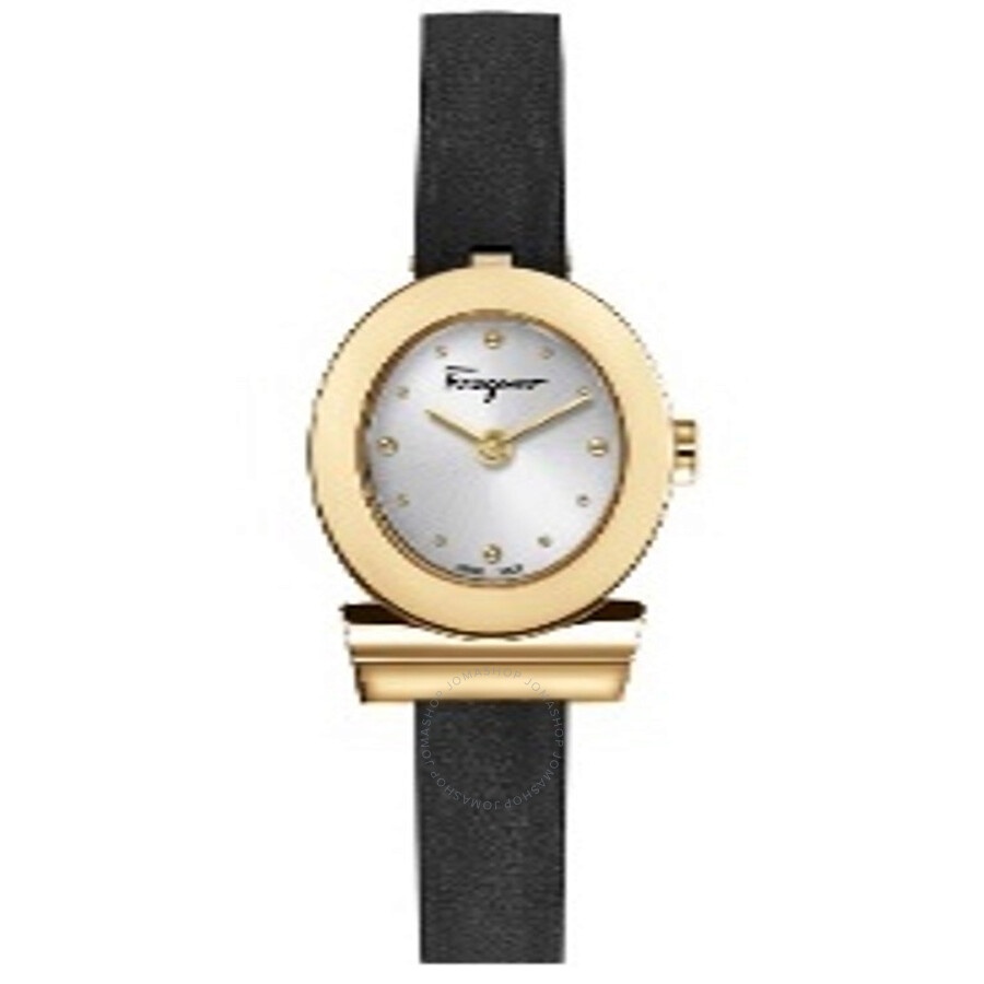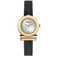 Gold-tone stainless steel case with a black leather strap. Fixed gold-tone stainless steel bezel. Silver dial with gold-tone hands and dots hour markers. Dial Type: Analog. Quartz movement. Scratch resistant sapphire crystal. Pull / push crown. Solid case back. Round case shape, case size: 27 mm. Buckle clasp. Water resistant at 50 meters / 165 feet. Functions: hour, minute. Gancino Series. Dress watch style. Watch label: Swiss Made. Ferragamo Gancino Quartz Silver Dial Ladies Watch SFPD02124. CASE Case Size: 27 Case Material: Stainless Steel Case Shape: Round Case Back: Solid BAND Band Material: Leather Band Type: Strap Band Color: Black Clasp: Buckle DIAL Dial Color: Silver Type: Analog Crystal: Scratch Resistant Sapphire Hands: Gold-tone Dial Markers: Dots Bezel: Fixed Bezel Color: Gold-tone Bezel Material: Stainless Steel Crown: Pull / Push INFORMATION Brand: Ferragamo Series: Gancino Collection Name: Gancino Gender: Womens Model: SFPD02124 Watch Label: Swiss Made Movement: Quartz FEATURES Water Resistance: 50 meters / 165 feet Functions: Hour, Minute Watch Features: Stainless Steel, Leather, Gold, Analog ADDITIONAL INFO Watch Style: Dress Warranty: 2 Year Jomashop Warranty Jomashop Sku: FR-SFPD02124 Department: Watches