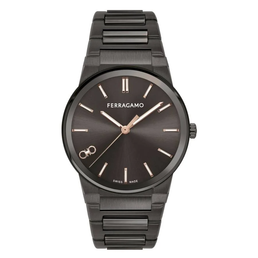 Gunmetal IP stainless steel case and bracelet. Fixed gunmetal IP stainless steel bezel. Grey sunray dial with rose gold-tone hands and index hour markers. Double gancini logo at the 8 o'clock position. Dial Type: Analog. Luminescent hands and markers. Quartz movement. Scratch resistant sapphire crystal. Pull / push crown. Solid case back. Round case shape, case size: 41 mm. Deployment with push button release clasp. Water resistant at 50 meters / 165 feet. Functions: hour, minute, second. Infinity Sapphire Series. Casual watch style. Watch label: Swiss Made. Ferragamo Infinity Sapphire Quartz Grey Dial Men's Watch SFST00524. GENERAL Box Type: Original Box CASE Case Diameter: 41 mm Case Material: Stainless Steel Case Shape: Round Case Back: Solid BAND Band Material: Stainless Steel Band Type: Bracelet Band Color: Gunmetal IP Clasp: Deployment with Push Button Release DIAL Dial Color: Grey Sunray Type: Analog Crystal: Scratch Resistant Sapphire Hands: Rose Gold-tone Dial Markers: Index Second Markers: Double Gancini logo at the 8 o'clock position Luminiscence: Hands and Markers Bezel: Fixed Bezel Color: Gunmetal IP Bezel Material: Stainless Steel Crown: Pull / Push INFORMATION Brand: Ferragamo Series: Infinity Sapphire Collection Name: Infinity Sapphire Gender: Mens Model: SFST00524 Watch Label: Swiss Made Movement: Quartz FEATURES Water Resistance: 50 meters / 165 feet Functions: Hour, Minute, Second Watch Features: Analog, Gold, Stainless Steel ADDITIONAL INFO Watch Style: Casual Warranty: 2 Year Jomashop Warranty Jomashop Sku: FR-SFST00524 Department: Watches